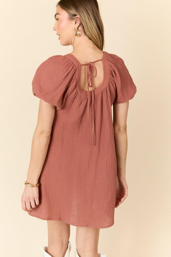 Details Brown Gauze S/S Mini Dress Fabric has no stretch Functional button up closure, back bow detail, short sleeves, functional pockets Unlined Size small from shoulder to hem: 30" Material and Care 100% cotton Machine wash cold, no drum drying Patterns may vary Materials may have natural variations Colors may vary from different viewing devices.