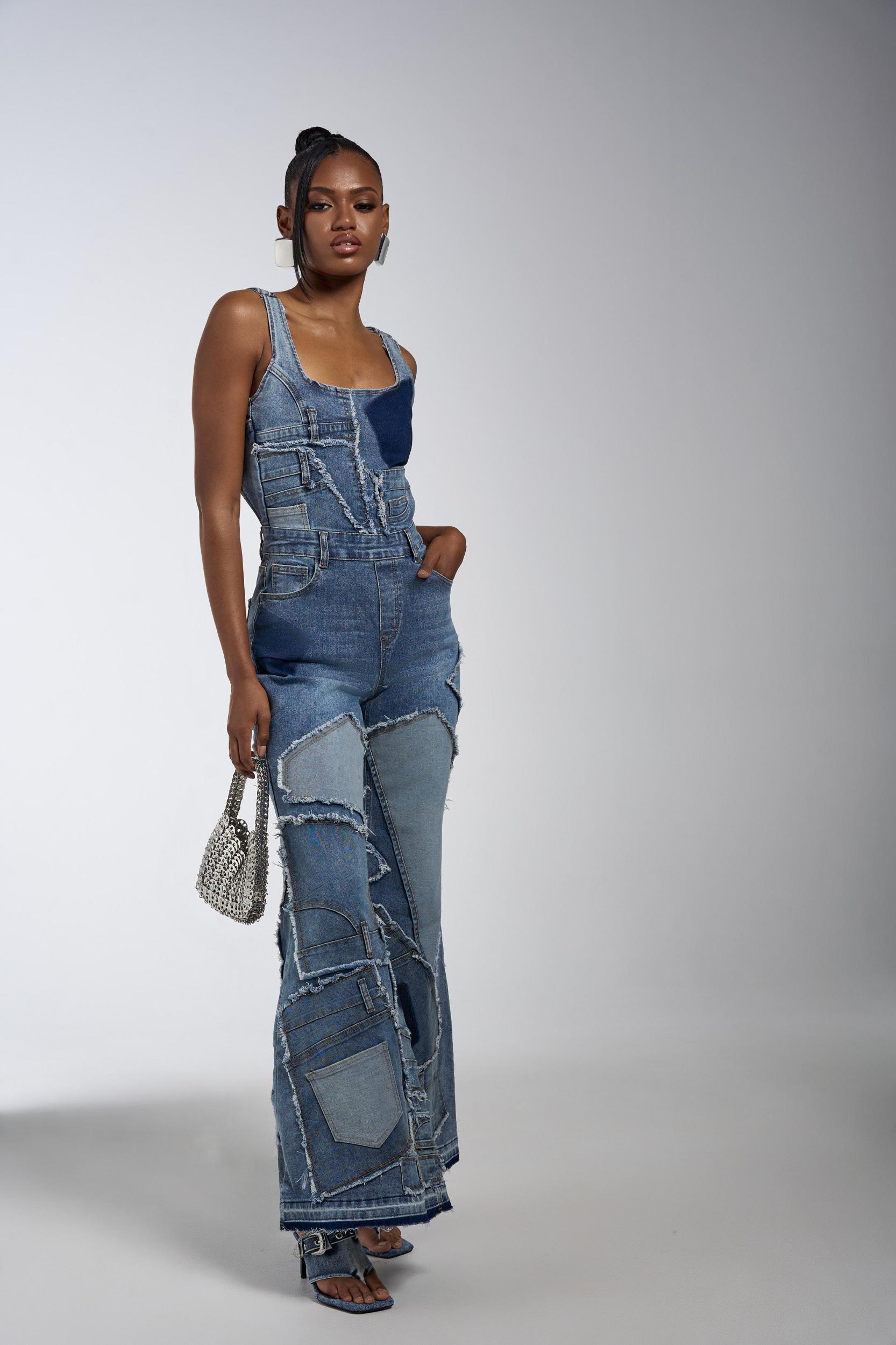 The AKIRA Label Life Of The Party Denim Patchwork Jumpsuit is a bold fusion of retro and rebellious energy. Crafted from mixed-wash denim panels, it features exaggerated patchwork detailing with raw frayed edges for a deconstructed look. The fitted bodice includes a scoop neckline and wide straps, leading to a daring back cutout and exposed zipper closure. A flared leg silhouette elongates the frame, making this statement jumpsuit perfect for those who love to stand out. - 73% Cotton, 25% Polyester, 2% Spandex- Some Stretch- Imported (all measurements approximate from size small)- 59” Shoulder to Hem- 31” Inseam- 12” Shoulder to Shoulder- Model is 5’9” and wearing a size smallProduct ID: 1060297 (all measurements approximate from size 1X)- 64” Shoulder to Hem- 32” Inseam- 14” Shoulder to ShoulderProduct ID: 1060301