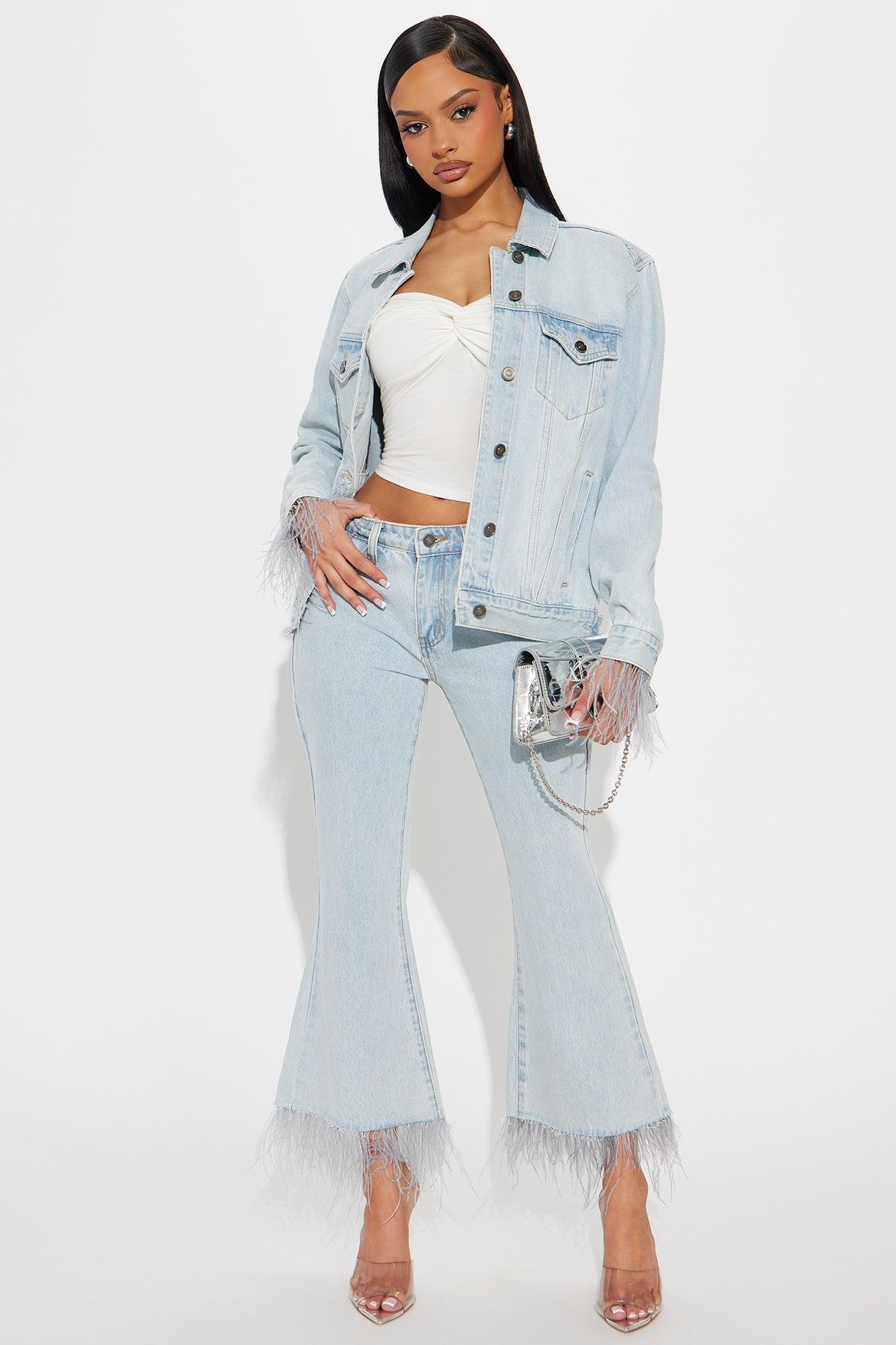 Available In Light Wash. Pair With Light As A Feather Trim Cropped Jeans Denim Jacket Collared Button Closure Fur Trim Cuff Pockets Non Stretch 100% Cotton Imported