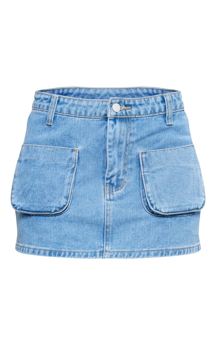 Lean into trend-led denim with the light blue wash cargo pocket front denim extreme mini skirt. This piece arrives in a cool light blue wash, boasting functional cargo pockets and an ultra-mini silhouette that’s perfect for day edits. Elevate this look by pairing it with a simple black crop top and step out with confidence in edgy **knee high boots**, adding statement **hoops** to complete the ensemble.Model Height - 5ft 10inchp]:!mb-4inch>Brand: PrettyLittleThingCategory: DenimProduct type: Denim Mini SkirtColor: Light Blue WashMaterial: Rigid DenimDesign: PlainOccasion: Day