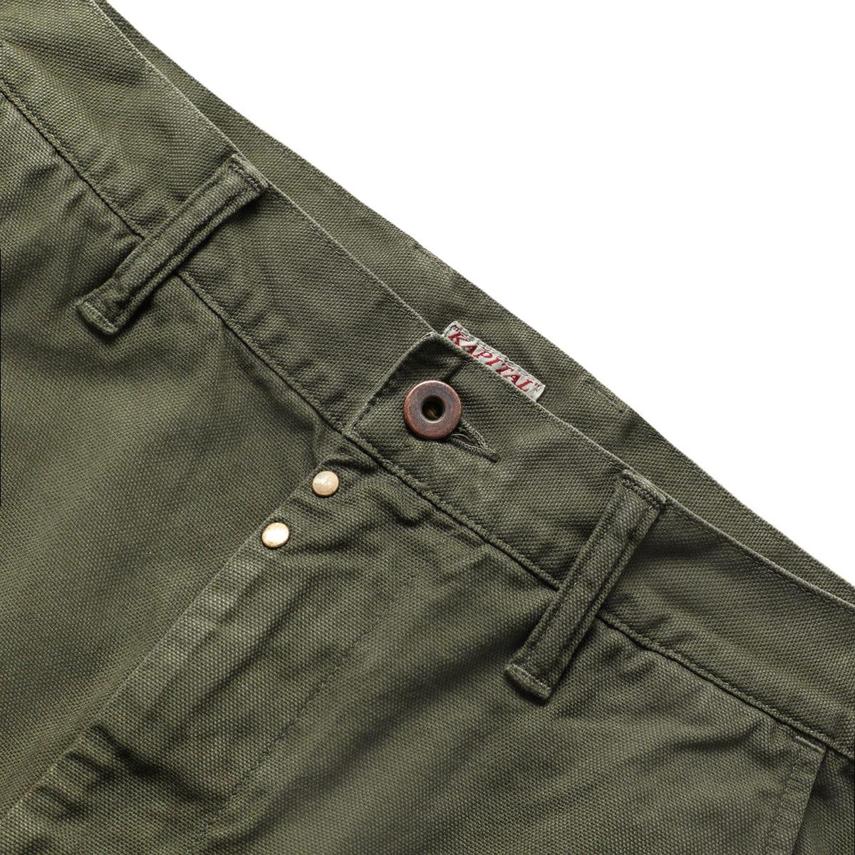 With the reputation as one of the most sought after names in the world of denim and alternate reality Americana , Kapital launched in 1996 and marries impeccable craftsmanship and innovative textile techniques with an intricately detailed, elegantly offbeat signature look, creating some of the most unique, authentic examples of 'future vintage' - garments and accessories coveted now that will only become more desirable as time goes on. A unisex, high-waisted pant based on vintage American work style trousers. The pants have been given a contemporary fit and are crafted in a hardwearing soft washed canvas. 100% cotton Two front slant pockets Single side utility pocket Button closure Zip fly Made in Japan EK-562