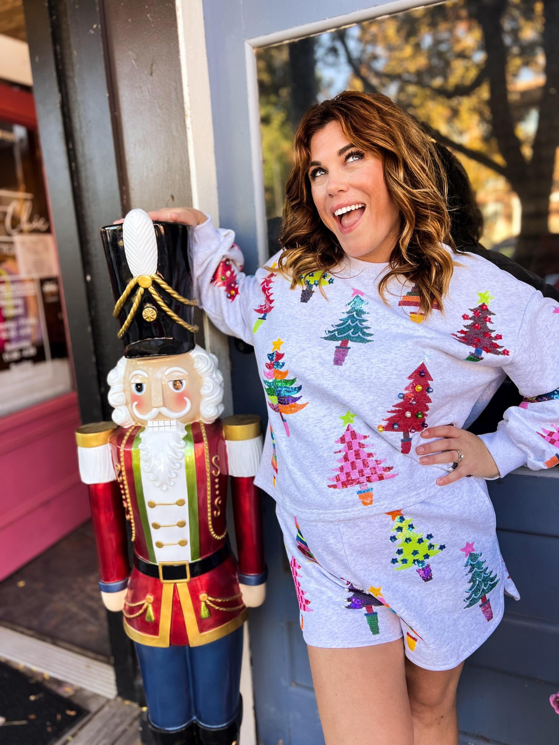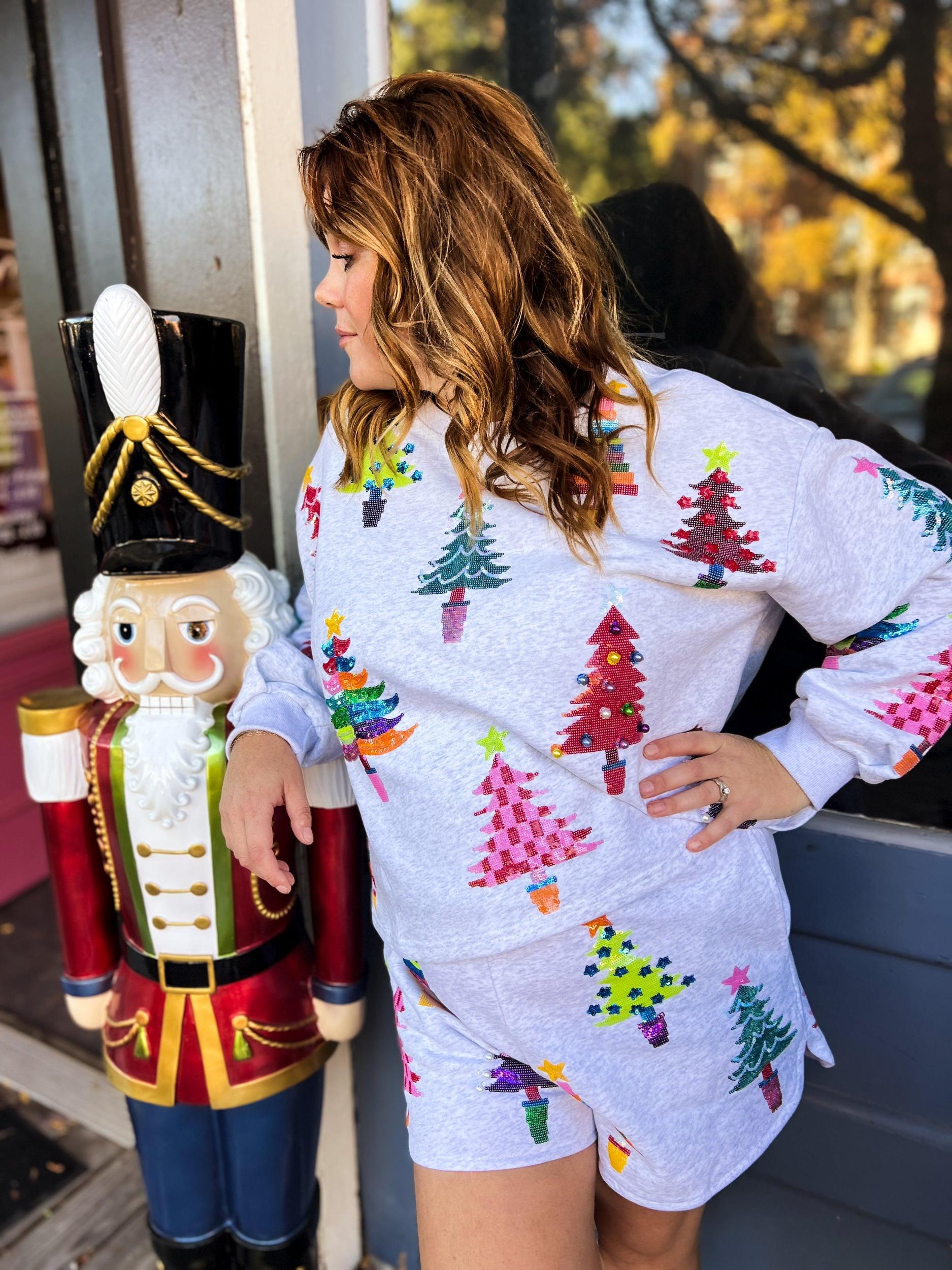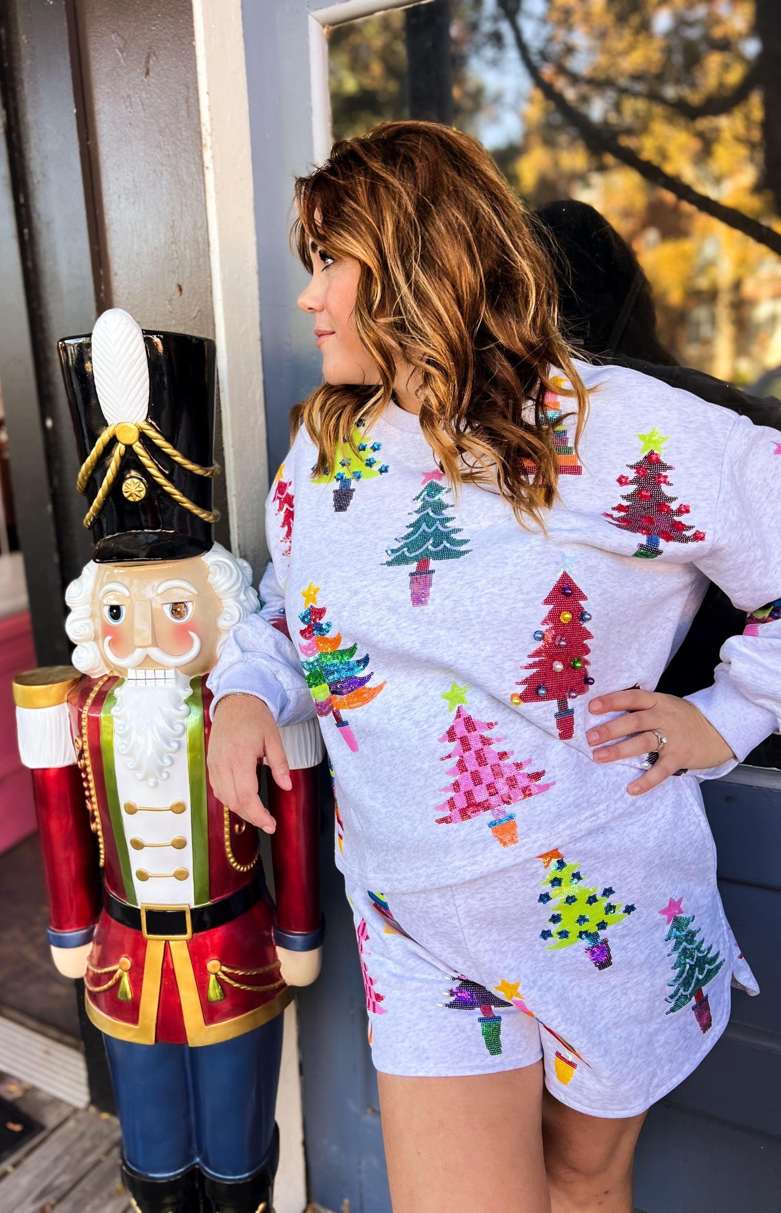 Get ready to sleigh all day in our Light Grey Colorblock Trees Shorts! These festive sweat shorts feature colorful Christmas trees, plus some extra sparkle with sequins and jewels. Perfect for the holiday season, and proudly brought to you by the Queen of Sparkles. Let's get merry and bright! 🎄✨👑
