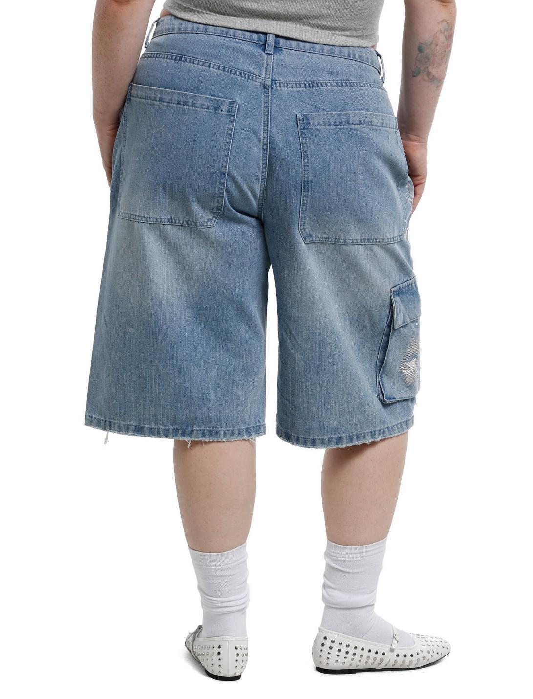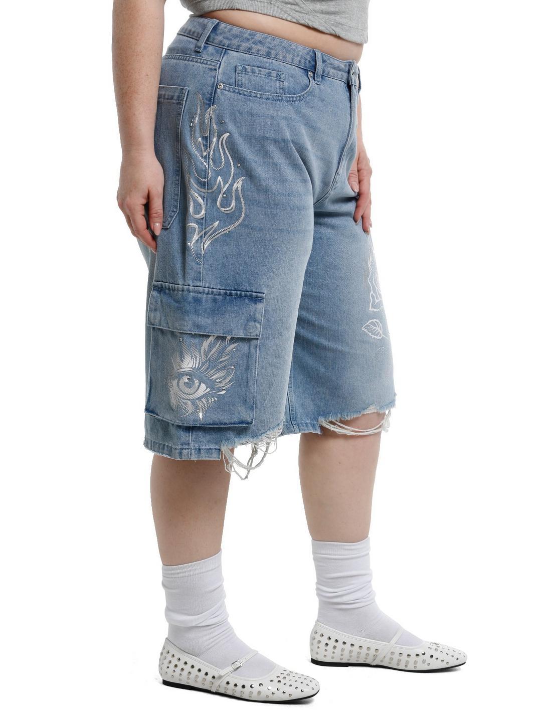 These light indigo jorts are perfect for summer! They are printed with white and silver foil graphics such as a flaming rose, regular flames and an eye with long feathering lashes. There are rhinestones decorating each graphic. There is a cargo pocket on the right side, and distressing at the bottom hems. No stretch.100% cottonWash cold; dry lowRise: 14"Inseam: 15"ImportedModel is 5'8 1/2"Model wears size 16