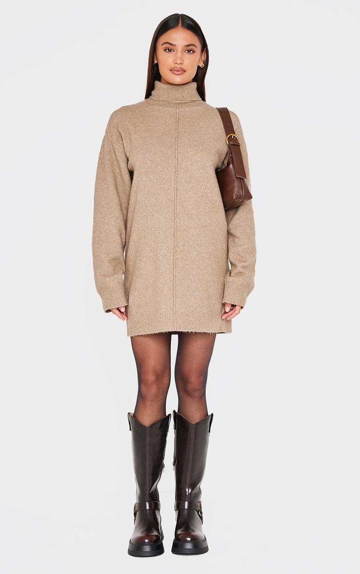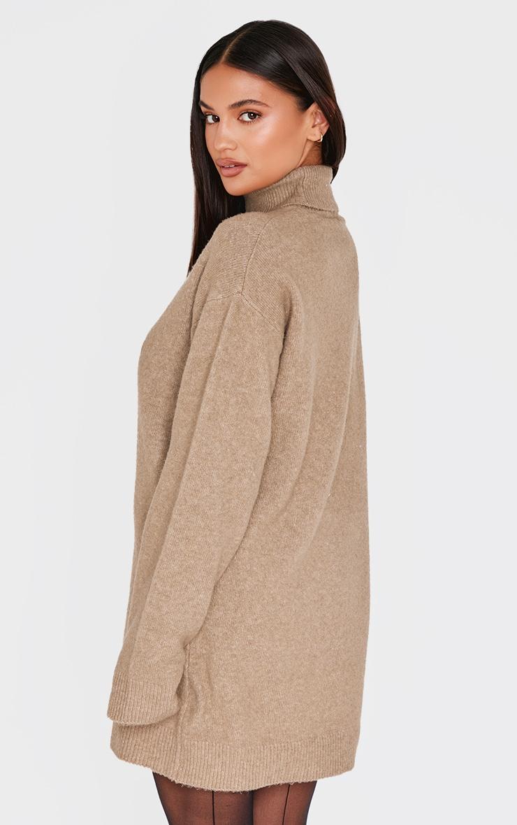 Amp up your neutral collection with this light mocha sot knit roll neck oversized seam detail sweater dress. Brought to you in a light mocha soft knit material with a roll neck design, an oversized fit and a seam detail, you are sure to feel cosy this season. Team with tights and accessories of your choice for a look. Length approx 105.5cm/41.5inch (Based on a sample size S) Model wears size SModel Height - 5ft 6inchp]:!mb-0inch>Category: KnitwearProduct type: Oversized Jumper DressColor: Light MochaMaterial: KnitDesign: PlainOccasion: Day