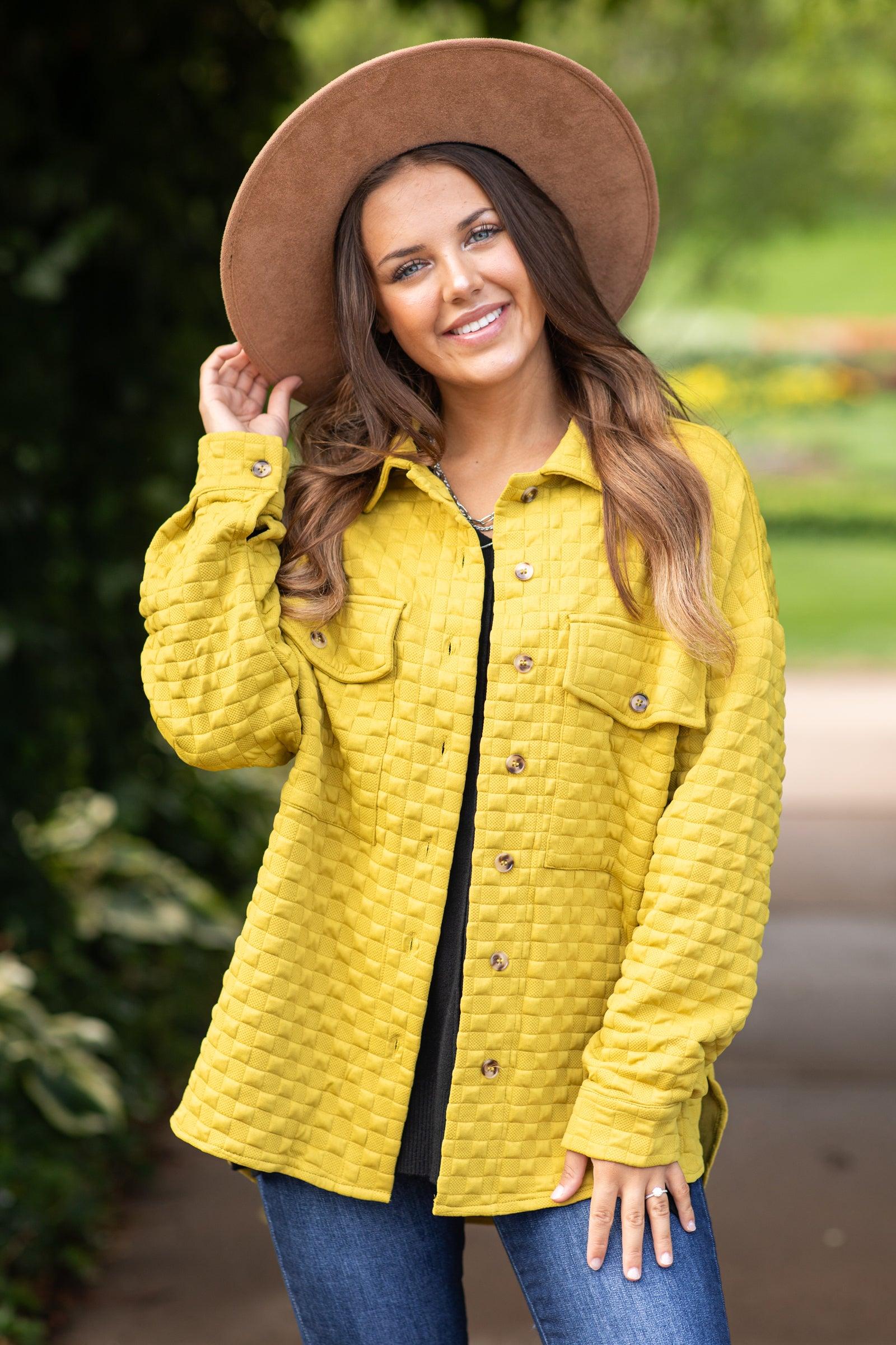 Product Details Colors: Light Olive Print: Solid Textured Collar: Button Up Sleeve: Long Sleeve Hemline: Round Hi/Lo Material and Care 97% Polyester 3% Spandex Hand Wash Cold Hang/Line Dry Size and Fit Small: Bust 48" Waist 46" Length 27.5"/31" Medium: Bust 50" Waist 48" Length 28"/31.5 Large: Bust 52" Waist 50" Length 28.5"/32" Model is 5'1 and wearing a size small