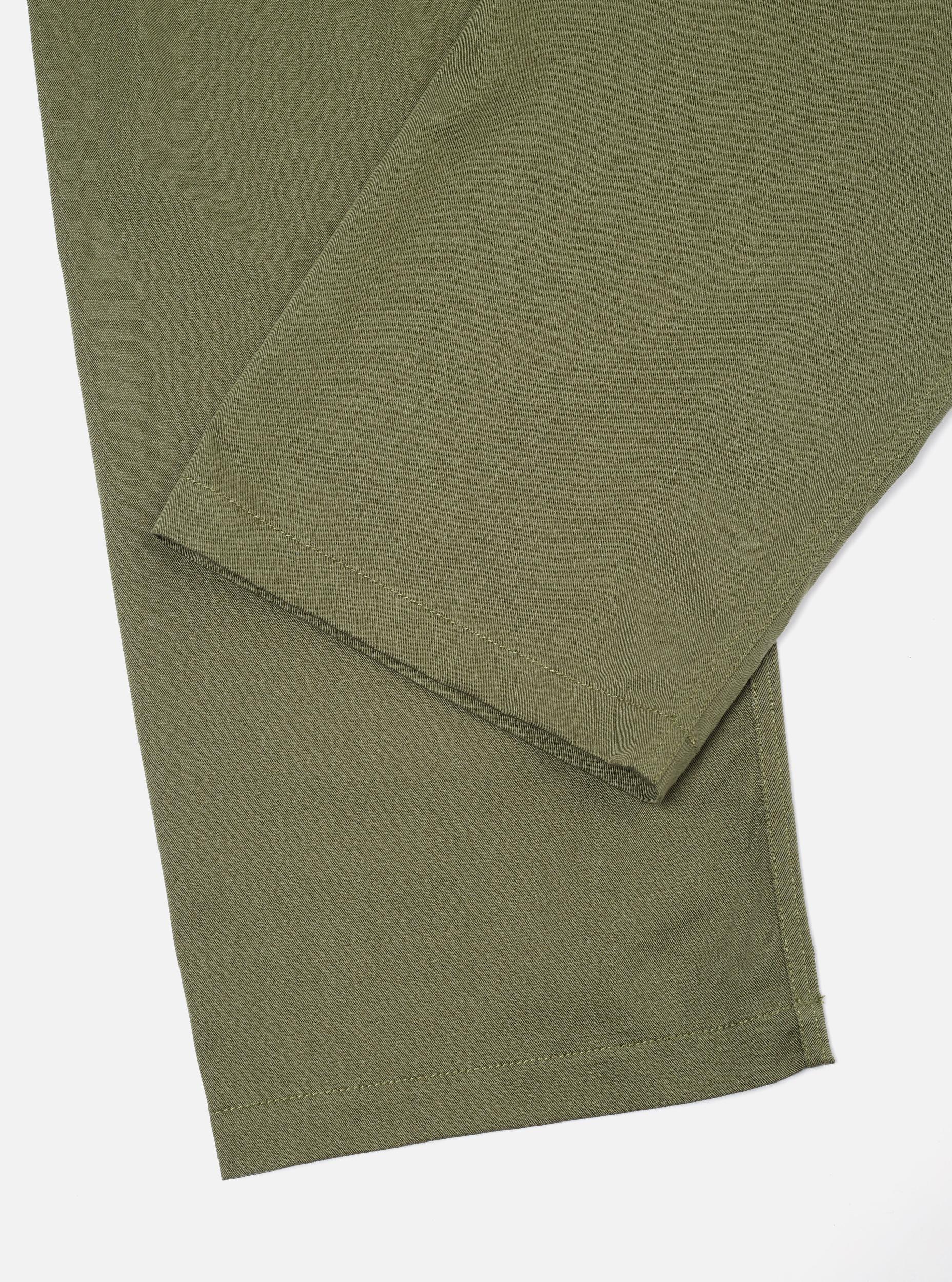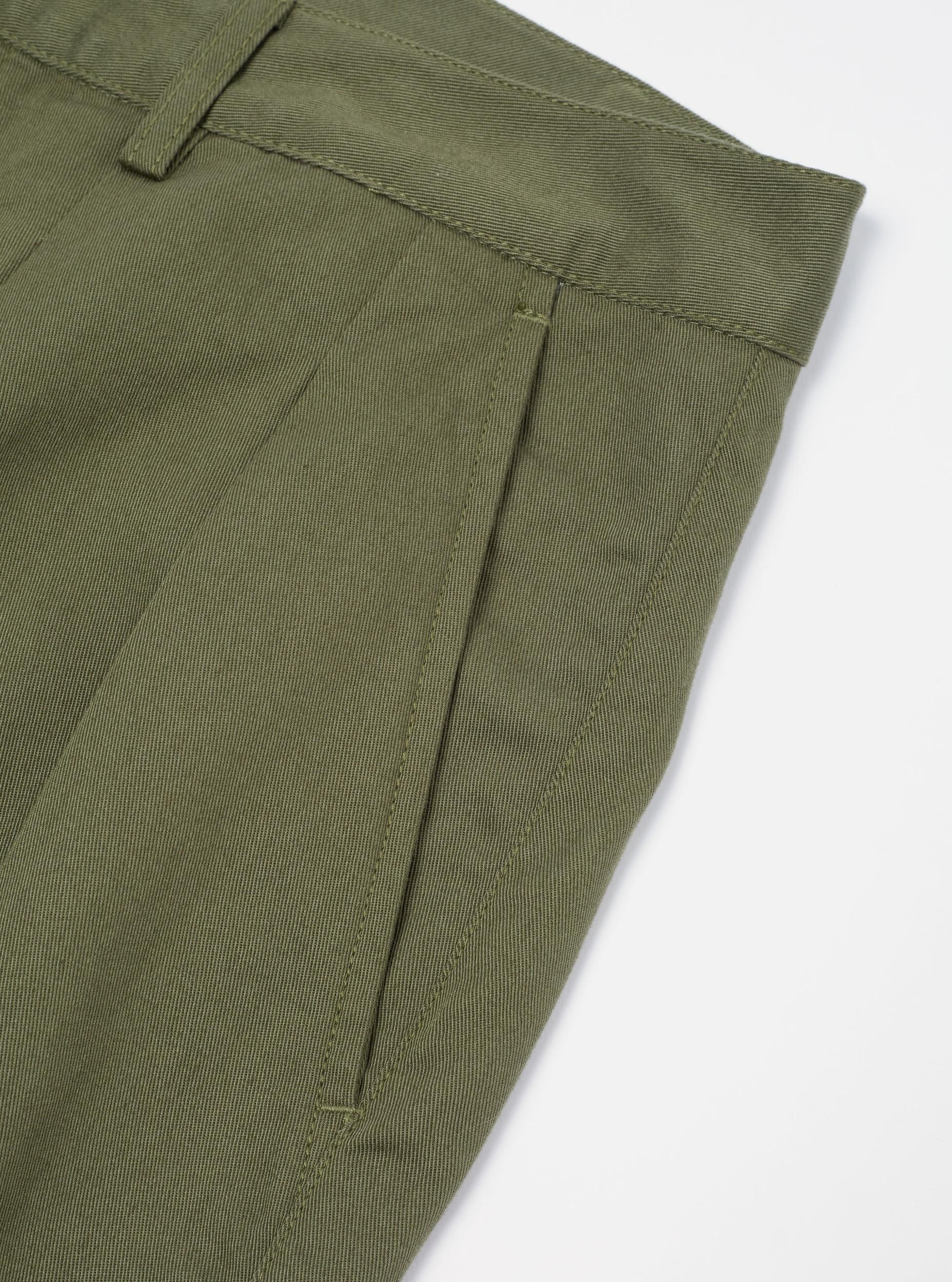 A UW. classic shape, with a double-pleated front and a loose straight leg, cleverly cut with no side seams to give a flattering leg shape. Exclusive UW. Fabric; 3/1 Twill Weave. • Product Code: 00133. • Wide leg with soft taper. • Zip fly. • Two front pleats. • Two front pockets. • Two rear pockets: One button flap, one buttoned jetted. • Fabric Content: 100% Cotton, 100% Cotton Trim. • Washcare: Wash at 30 degrees. Do not bleach. Do not tumble dry. Warm iron. Do not dry clean. Wash like colours together. Please be aware if purchasing as a suit, that jackets and trousers are not necessarily cut from a single piece of cloth and therefore minor variations could be possible. Exchanges can be made for any two or three pieces not pairing perfectly. [sizing] Please be aware that the measurements below are technical measurements that are based on the garment laid flat and are useful as a general guide only. You can find a trouser fitting guide on our journal here. For advice on sizing, we have a small guide available here - or alternatively, contact us if you'd like any help. Measured in Centimetres. 26" 28" 29" 30" 31" 32" 33" 34" 36" 38" Outside Leg - Inc. Waistband. 99 102 103.5 105 106.5 108 110 112 115 115 Waist. 35 37.5 38.75 40 41.25 42.5 43.75 45 47.5 50 Thigh - 2.5cm Below Crotch. 32.5 34 34.75 35.5 36.25 37 37.75 38.5 40 41.5 Hem Opening Width. 20 21 21.5 22 22.5 23 23.5 24 25 26 Front Rise Inc. Waistband. 34 35 35.5 36 36.5 37 37.5 38 39 40 Back Rise Inc. Waistband. 42 43 43.5 44 44.5 45 45.5 46 47 48