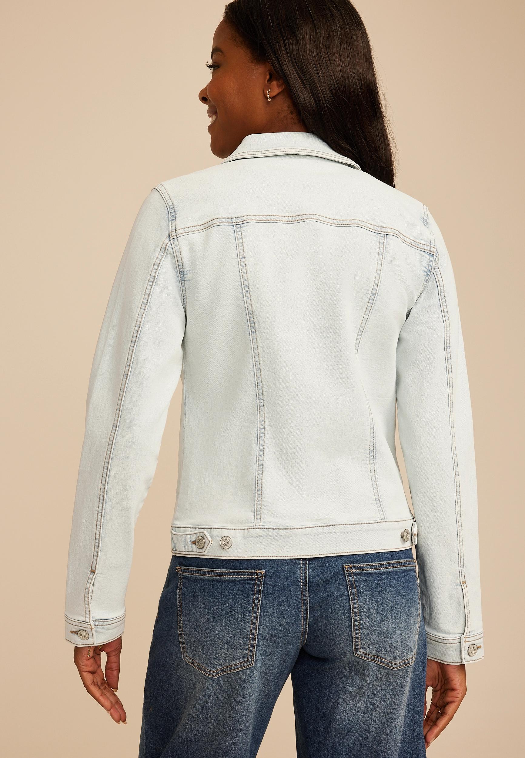 Meet your go-to layer: this classic light wash denim jacket brings timeless style with a soft, broken-in feel. Its button-front design and tailored seams create a flattering silhouette that works for every season. .mar-pdp-section .mar-product-description {color: #000;}.mar-pdp-section .mar-product-description ul, .mar-pdp-section .mar-product-description ul>li {margin-left: 10px;padding-left: 10px;}.mar-pdp-section .mar-product-description .mar-product-description-content ul li{list-style-type: disc;margin: 0 0 5px;padding-left: 5px;}.mar-pdp-section .mar-product-description p {color: #000;padding: 5px 0;}@media only screen and (max-width: 1023px){.mar-pdp-section .mar-product-description .mar-product-description-content ul li{list-style-type: disc !important;} .mar-pdp-section .mar-product-description .mar-product-description-content .mar-tab-content ul{padding-left: 10px;}.mar-pdp-section .mar-product-description .mar-product-description-content .mar-tab-content {font-weight: 300;}} Features: super stretch: do-it-all stretch that fits your every move light sandblast wash long sleeves with button cuffs for adjustable styling. two side welt pockets for functionality finished hem classic button front closure with metallic hardware