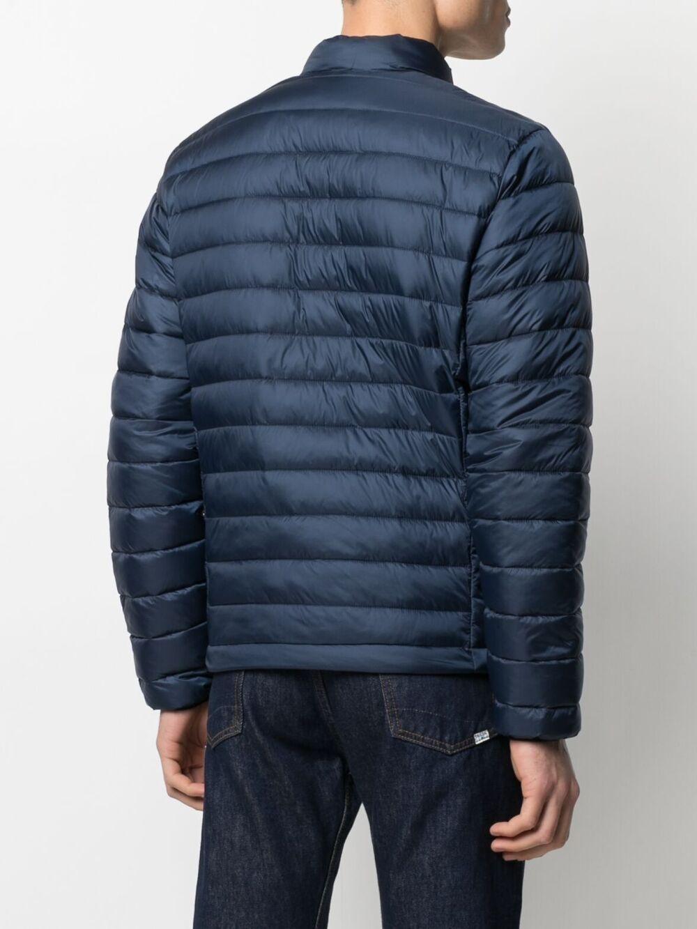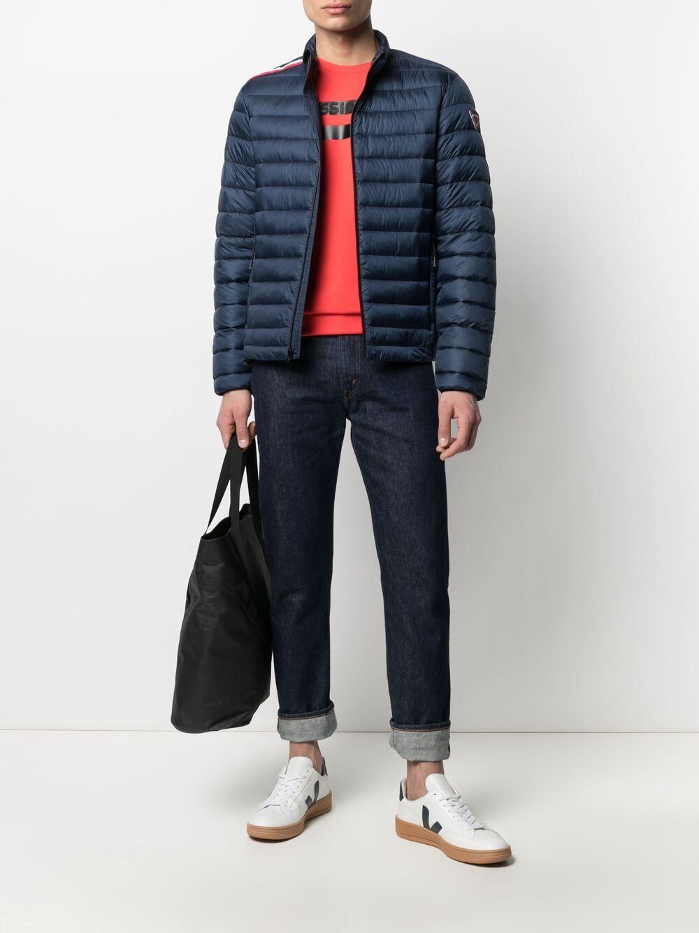 dark navy mock neck padded design front zip fastening long sleeves logo patch at the sleeve front zip fastening pockets