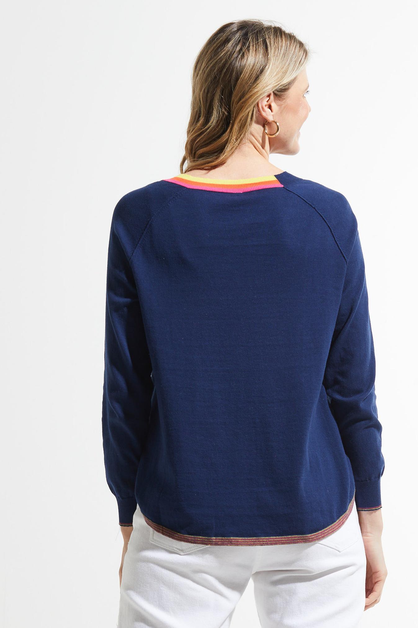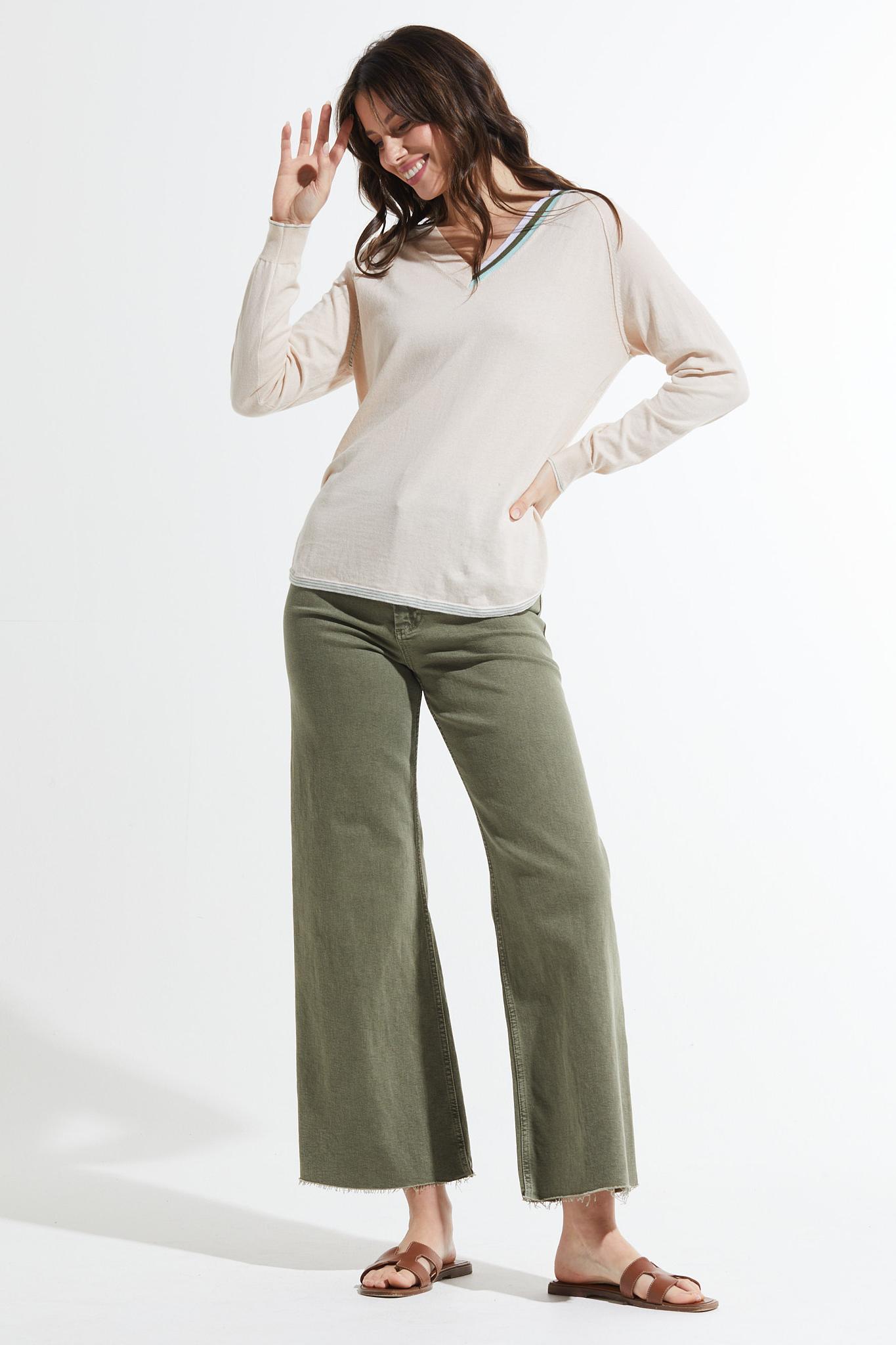 Stay effortlessly stylish with this lightweight V-neck sweater, designed for ultimate comfort and versatility. The relaxed silhouette drapes beautifully, while the subtle stripe details along the neckline, cuffs, and hem add a touch of modern sophistication. With its hi-low hem and side slit accents, this sweater offers an easygoing yet polished look—perfect for layering or wearing solo.