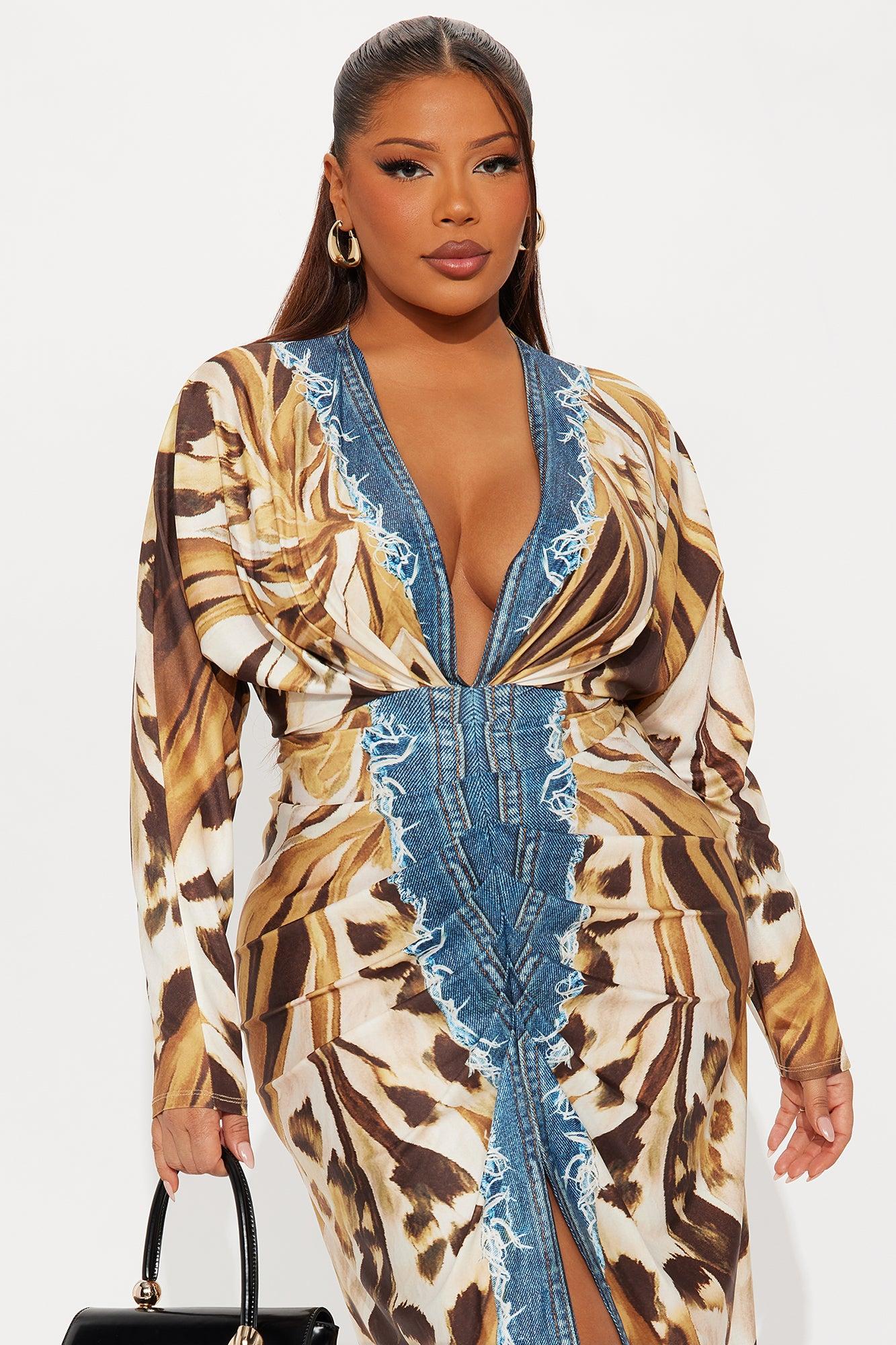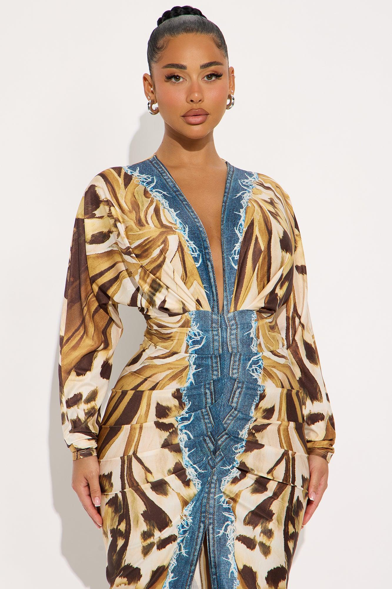 Available In Brown/combo. Printed Midi Dress Deep V-Neckline Long Sleeve Ruched Front Slit Stretch Length Measured Flat = 49" Disclaimer: Due To The Printing Process A Difference In Saturation May Occur. Each Garment Is Unique. Print Placement Will Vary. 89% Polyester 11% Spandex Imported