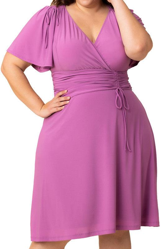 Transition seamlessly from day to night with the Plus Size Jemma Ruched Tie Dress. This elegant knee-length dress features a flattering surplice V neckline and elbow-length flutter sleeves, perfect for work events and dinner dates. Adjustable drawstring tie details at the waistband and shoulders allow for customizable ruching, ensuring a flattering fit that highlights your curves.