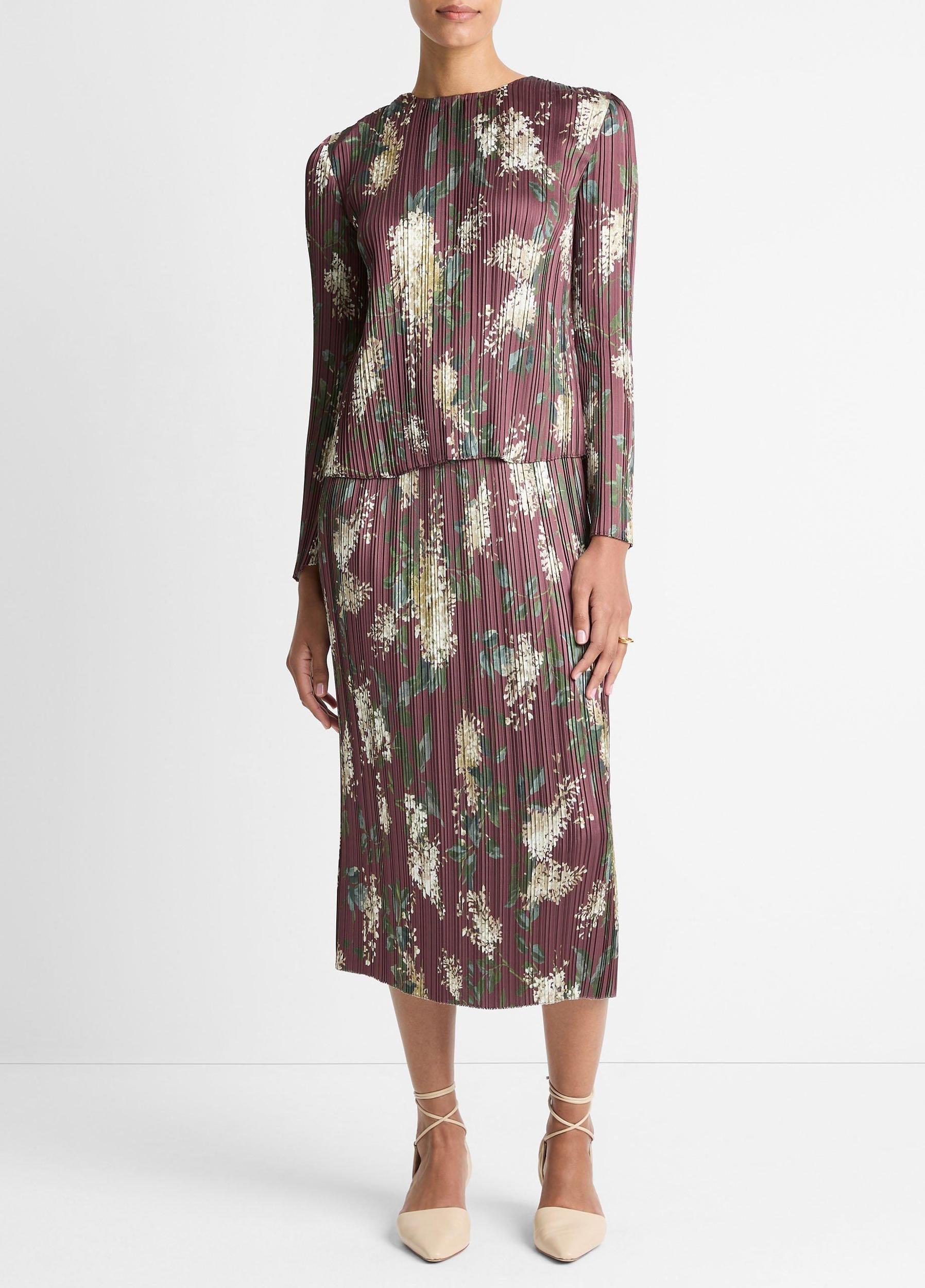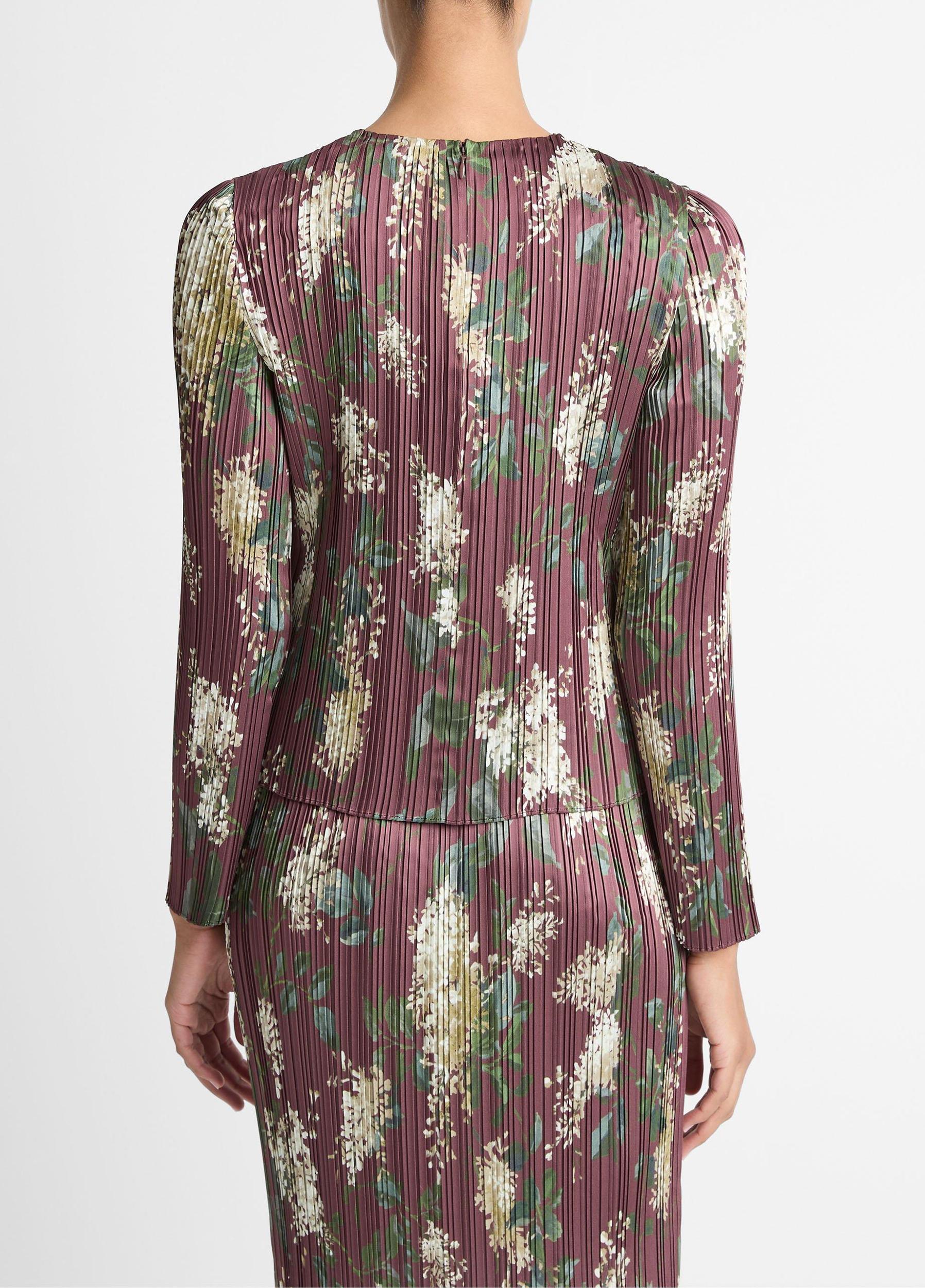 Variegated pleating adds even more dimension to our satin top's lilac print. It pairs back to our matching skirt, but tucks beautifully into your favorite denim or trouser, too.