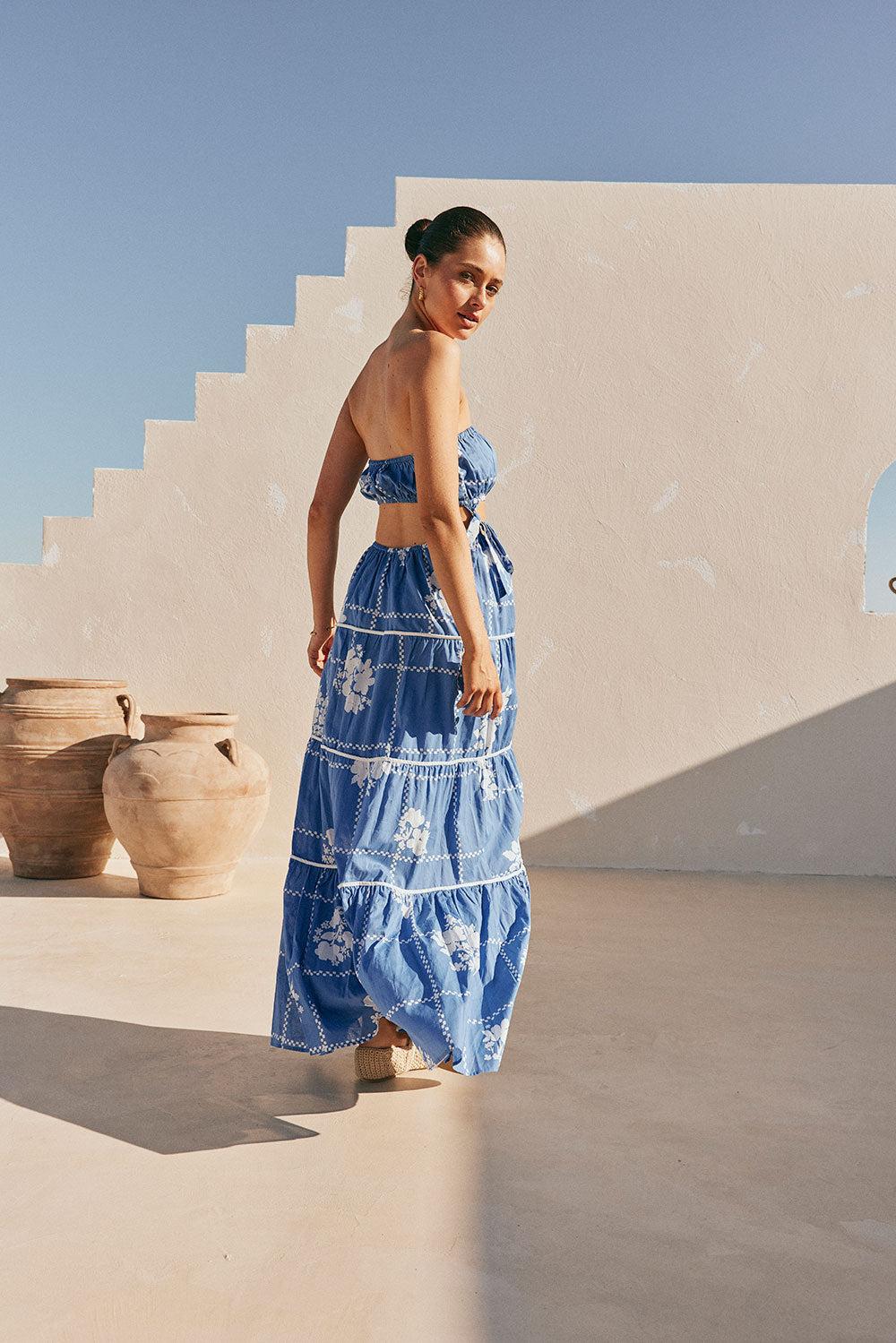 Introducing the swoon-worthy Lili Dress, made from a high quality natural cotton voile fabric with our exclusive check flowers print. It features a strapless neckline, keyhole cutouts at waist with tab tie details, tiered maxi skirt with contrast white trims and a split. Dress up your look with the Dia Heels for your next long lunch! Designed exclusively by Sabo.