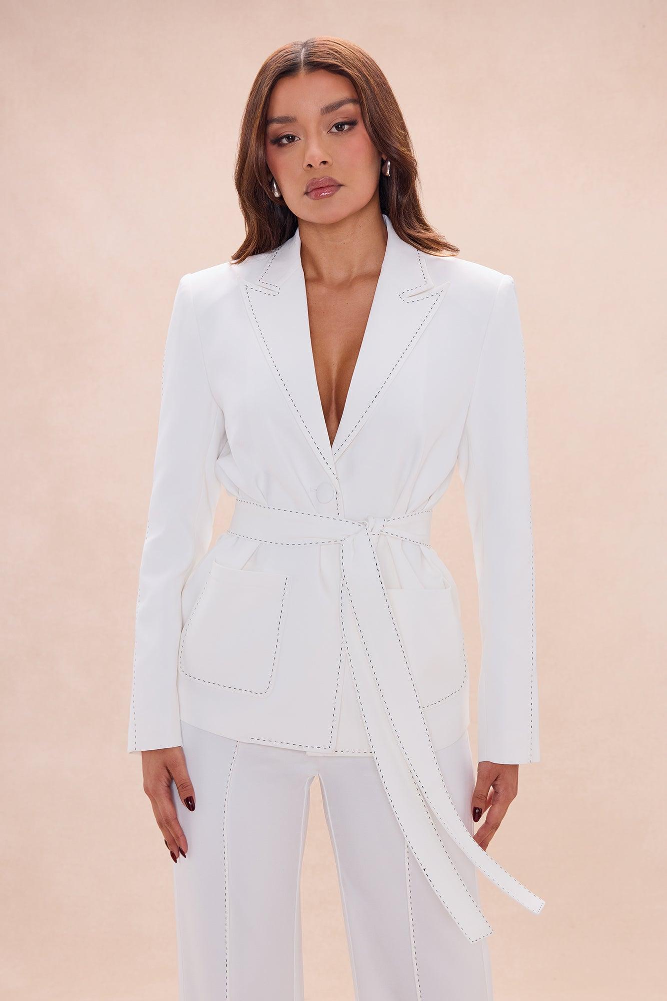 Available In White. Blazer Pant Ensemble BlazerLong Sleeve Shoulder Pads Collared Contrast Stitching Tie Waist Belt, Pockets Front Button Closure Lined Non Sretch Pant , Pockets Contrast Stitching Self: 95% Polyester 5% Spandex Lining: 100% Polyester