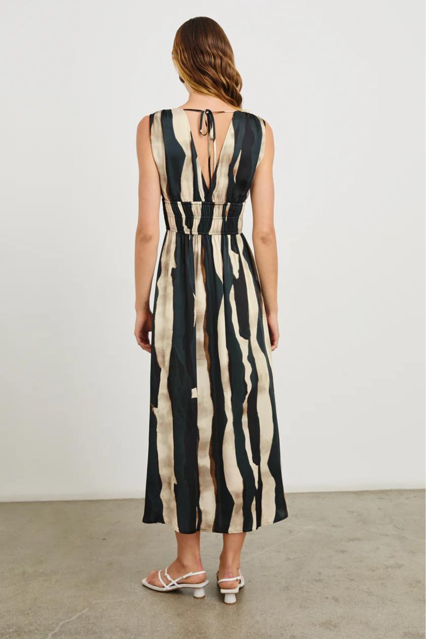 A midi dress with a plunge neckline crafted from a supple rayon crepe. With smocking, wide straps and an adjustable back strap, the Lilith has a flowing silhouette that cinches at the waist.