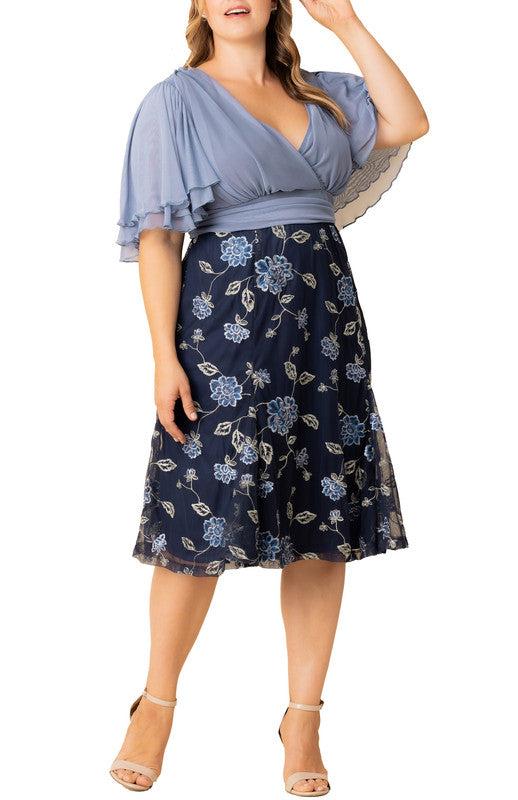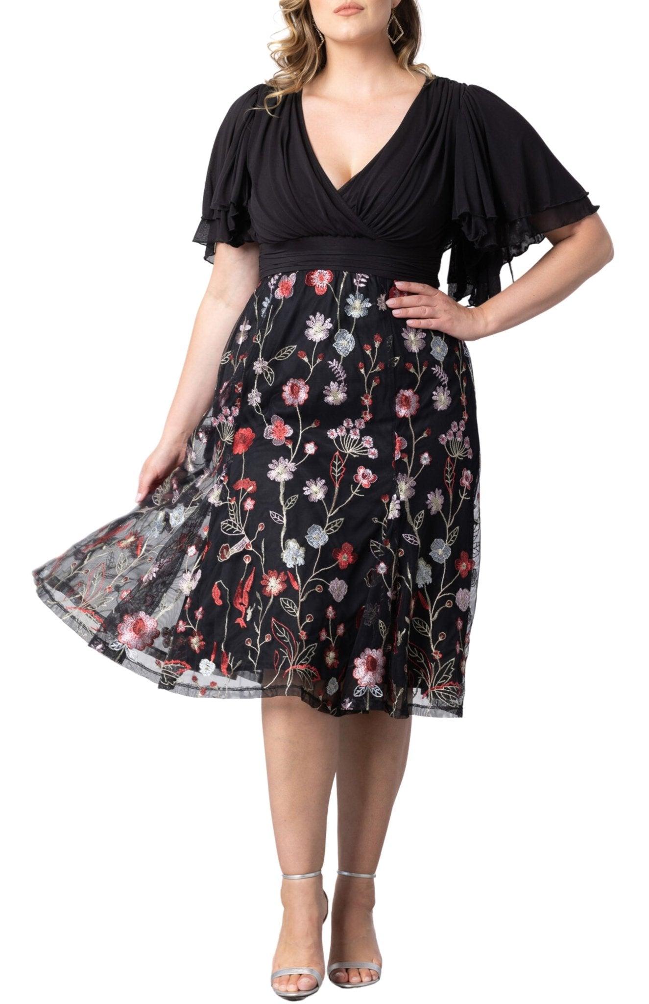 The Lillian Embroidered Cocktail Dress is a perfect plus size party dress, featuring a black mesh bodice, surplice neckline, double layer flutter sleeves and a softly shirred waistband. The floral embroidered skirt includes godets for flirty movement.
