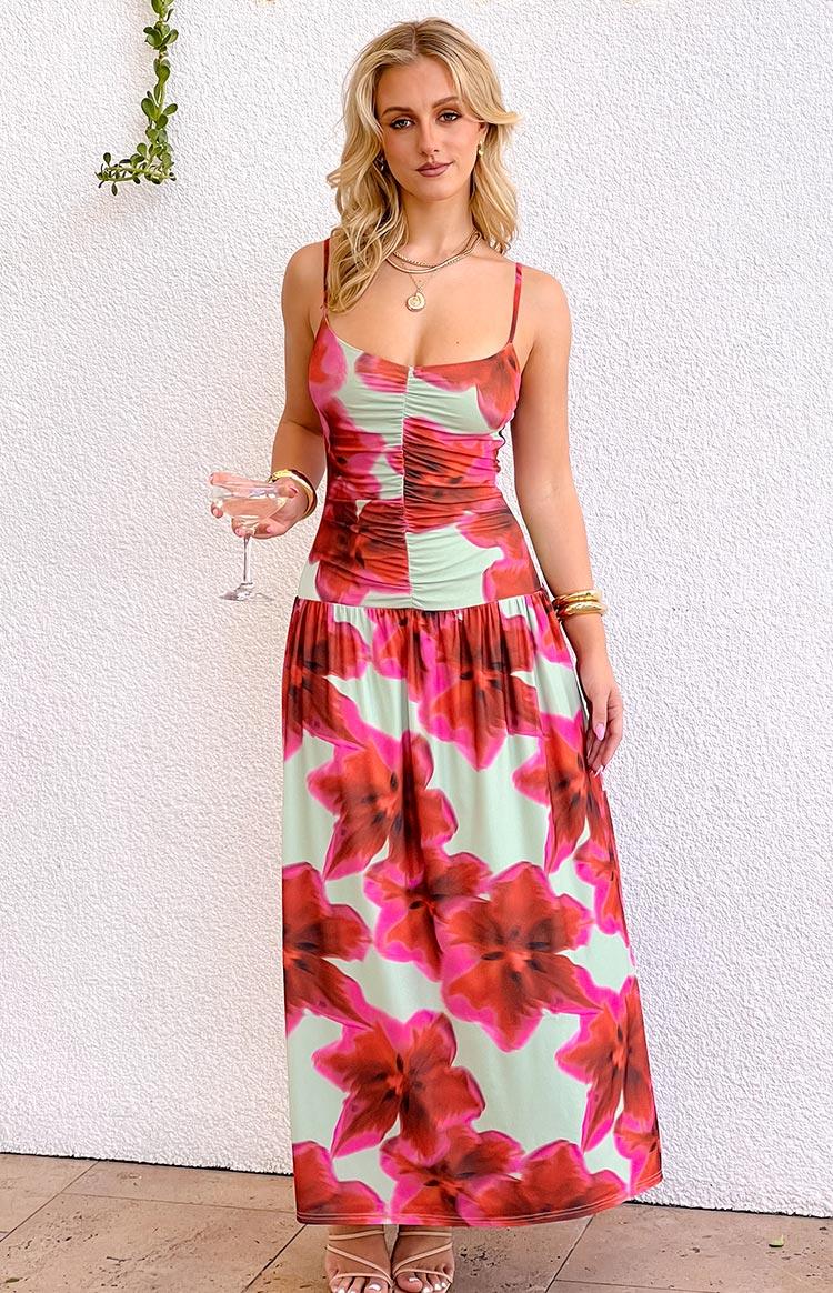 Green Floral Print Maxi DressHow to style:Embrace vibrant summer vibes with our Liliana Green Floral Print Maxi Dress! Crafted from soft jersey fabric, it features a flattering gathered bodice and a flowy maxi skirt that creates effortless movement. Pair with heels and a shoulder bag for the perfect evening look or add a pop of colour with accessories for a standout ensemble!Features: Maxi length Double lined in jersey Gathered bodice at front and back Flowy skirt Straight adjustable shoulder straps Main fabric mesh Placement will differ between pieces Perfect for wedding guests or birthdays!