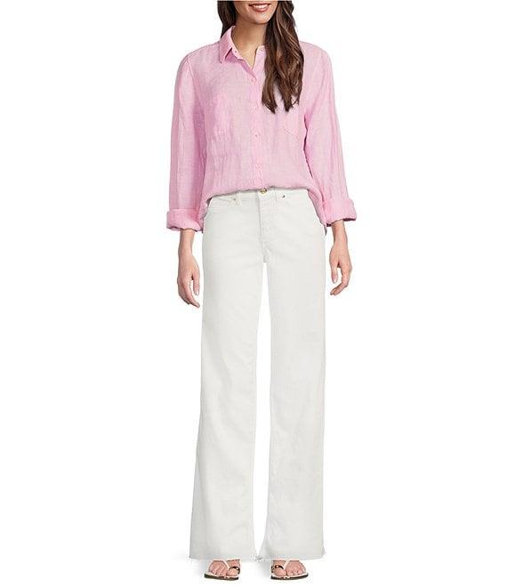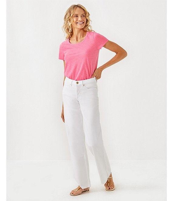 From Lily Pulitzer, this jean features: Beachfront stretch denim fabrication High-rise Straight leg Raw hem Front zip closure Approx. 33" inseam Cotton/rayon/spandex Machine wash/tumble dry Imported.