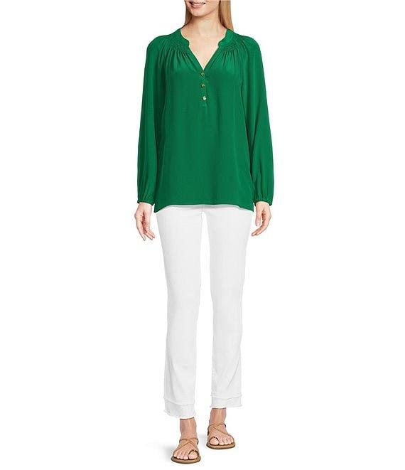 From Lilly Pulitzer, this blouse features: Luxurious silk fabrication V-neckline Bracelet sleeves Smocked neckline UnlinedStraight hemlineGold button placket closure Approx. 28" length SilkDry clean Imported.