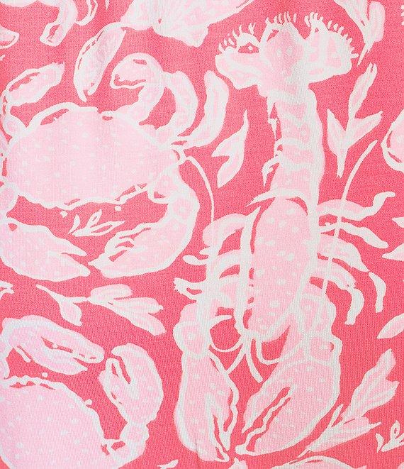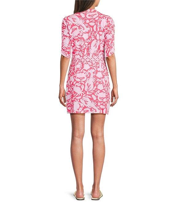 From Lily Pulitzer, this romper features: Jersey knit fabrication Cane coral crab printSurplice v-neckline Wrap silhouetteElbow ruched sleeves Skirted romper Self tie detail Back zip closure Approx. 17" from waist; 3" inseam Rayon/spandexMachine wash Imported.