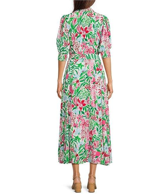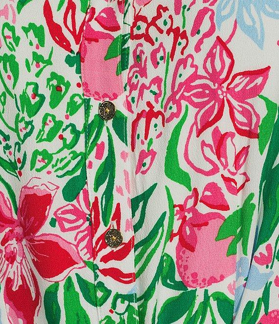 From Lilly Pulitzer, this dress features: Woven fabrication Shirtdress silhouette Glowing gardens print Notch collar neckline Short sleeves Tie waist sash detail Godet skirt detail Straight hem Button front placket clousre Approx. 36" length Viscose Dry clean Imported.
