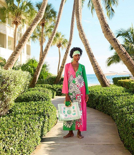 From Lilly Pulitzer, this swim cover-up features: V-neckline Long sleeves Maxi length Side slits Pull-over construction Approx. 39" length from neckline to hem Polyester Machine wash or dry clean Imported.