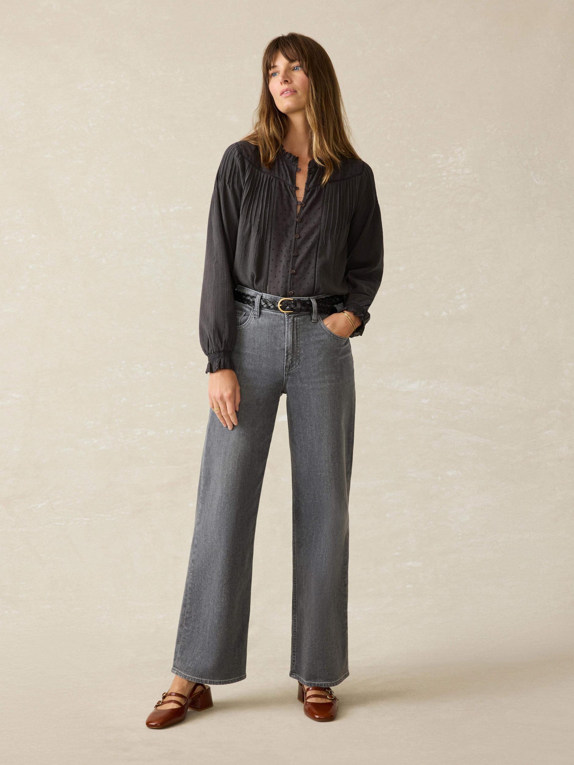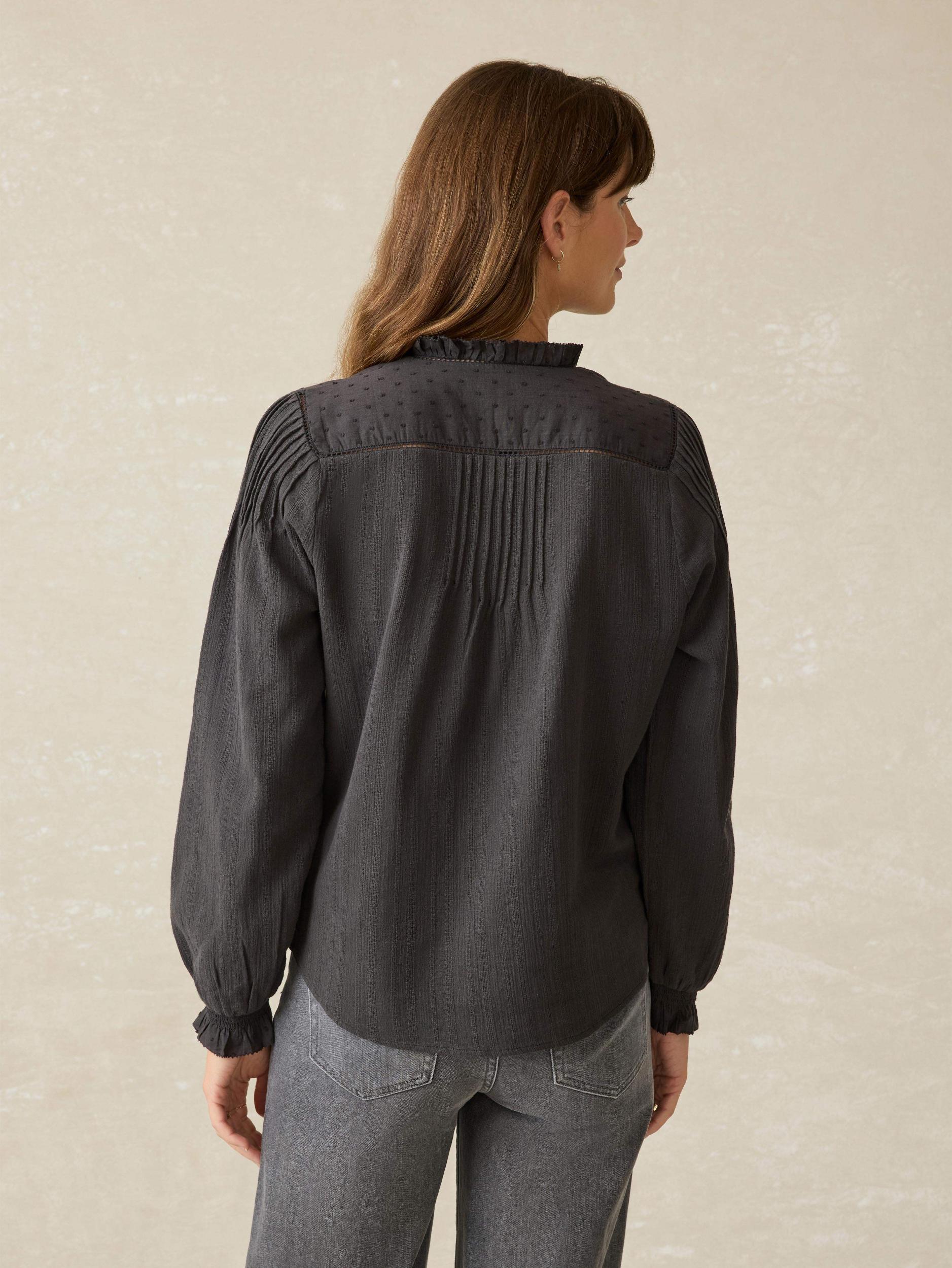 Our new fall top flows like a dream with artisanal details that elevate it from the everyday. With delicate pintucks at the bodice, charming ladder trim inserts, and a cotton dobby combination fabric that gives a lovely ruffle, this blouse exudes a low-key romantic charm. Balance the look with your favorite jeans for an outfit that's perfect for just about every meetup. Fit: Relaxed fit Detail: Pintucks at front and back bodice. Ladder trim inserts along yokes, armhole, and neckline. Cotton dobby combination fabric at neckline ruffle and sleeve finish. Smocking detail at sleeve finish. Button-through placket with mussel shell buttons Material: 100% Organic Cotton, Agoya Shell Buttons, Elastic Model: Christabel is 5'10.5 wearing size Small Care: Close all fastening before wash. Turn inside out. Machine wash cold with like colors. WTF2406-WBK