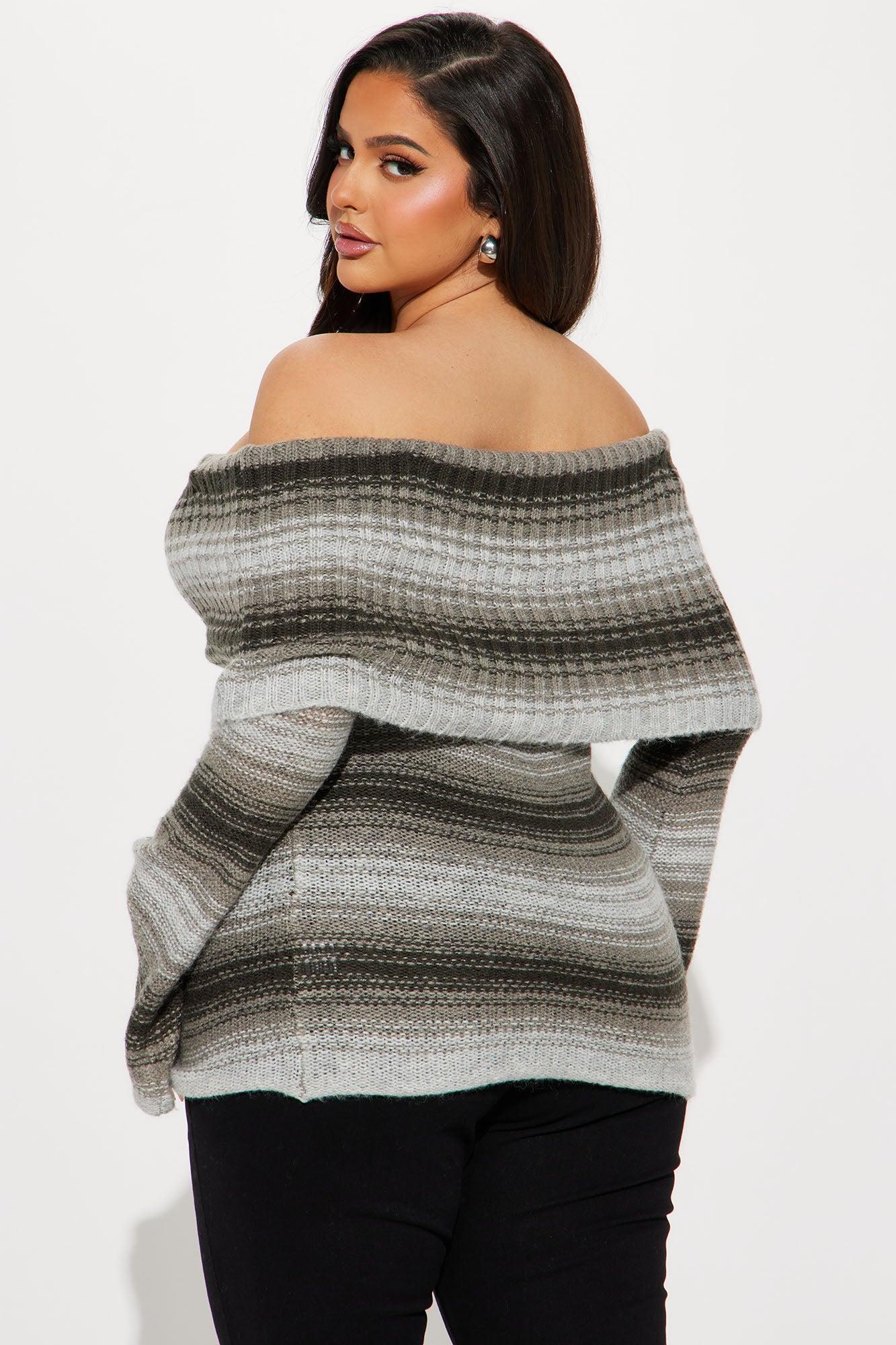 Available In Grey/combo. Striped Pullover Sweater Long Sleeve Bell Sleeve Off Shoulder Fold Over Detail Ribbed Hem 55% Acrylic 22% Nylon 15% Wool 8% Mohair Imported California Proposition 65WARNING: Cancer and Reproductive Harm - www.P65Warnings.ca.gov.