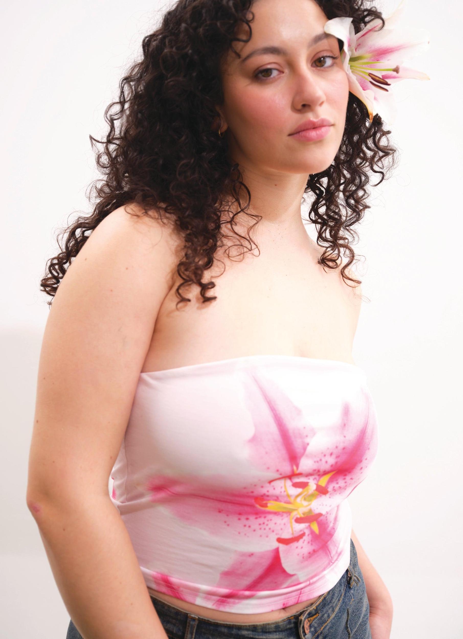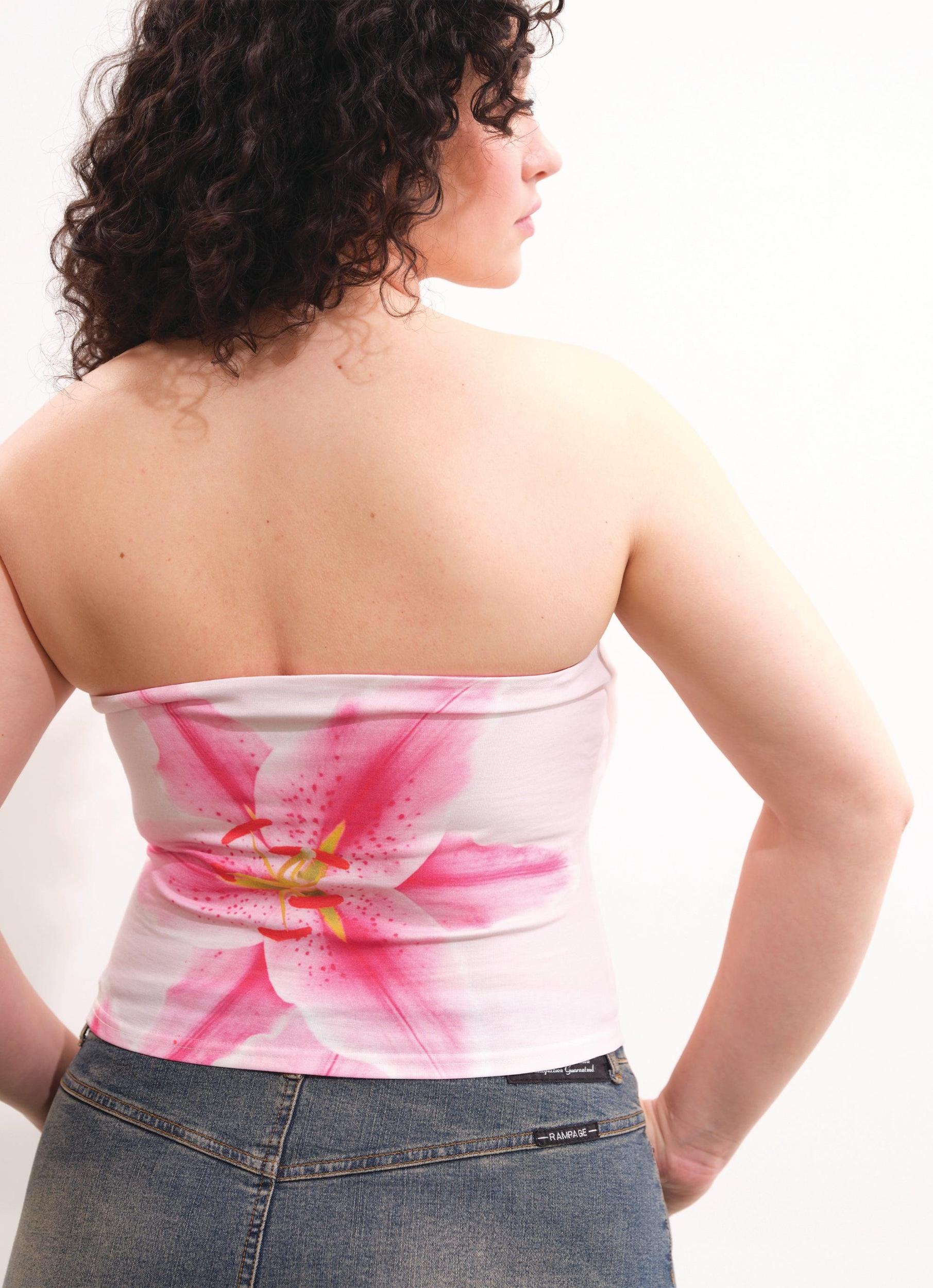 Blend into your favorite bouquet with our Lily Tube Top. Cut from a thick spandex cotton, this tiny tube top is printed with a single pink lily that blends into the background and makes it look like you're wearing a flower. Top hem is lined with semi sticky binding so the top stays perfectly in place. Cearah is 5'8" and wears a size medium.