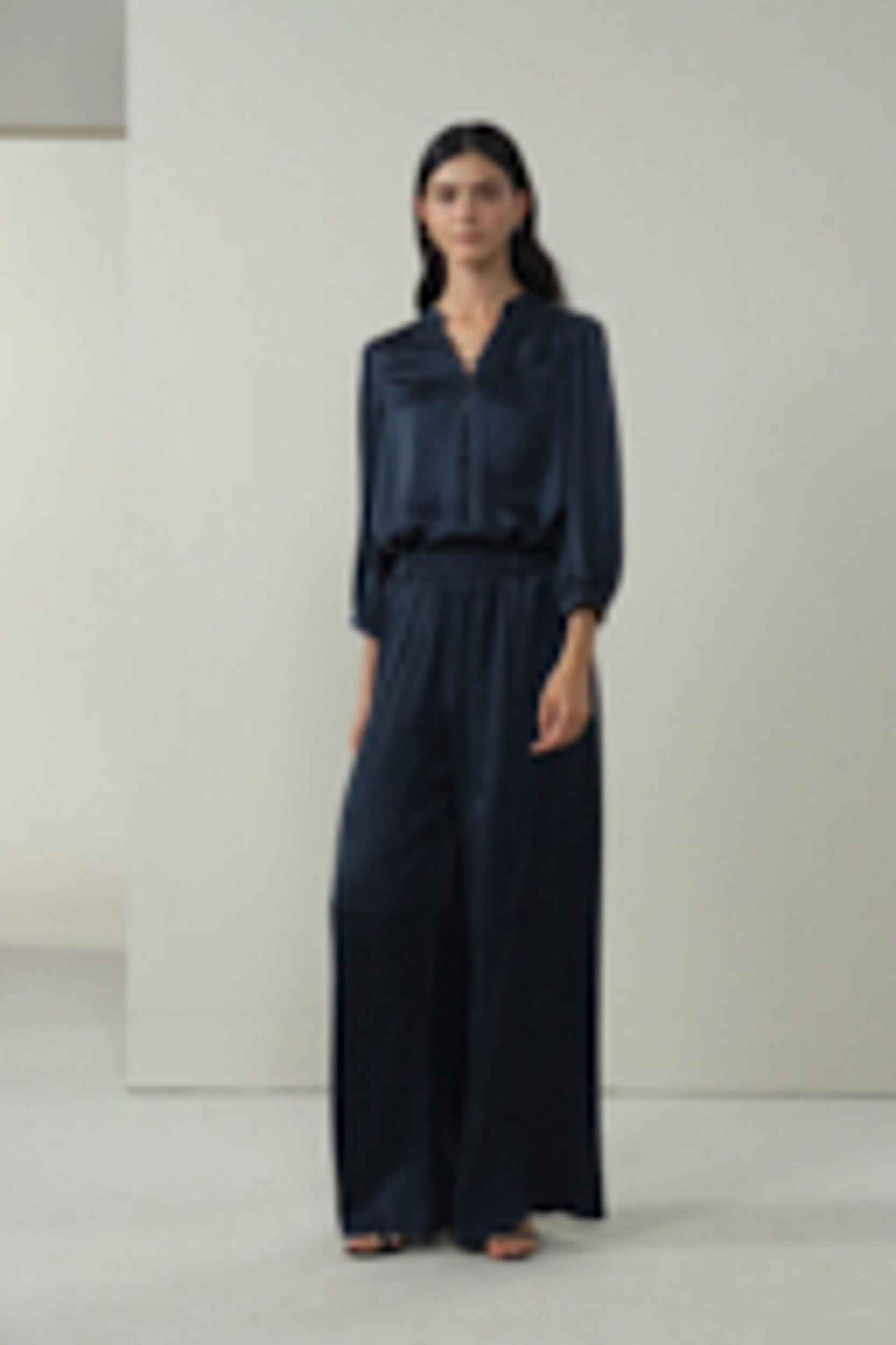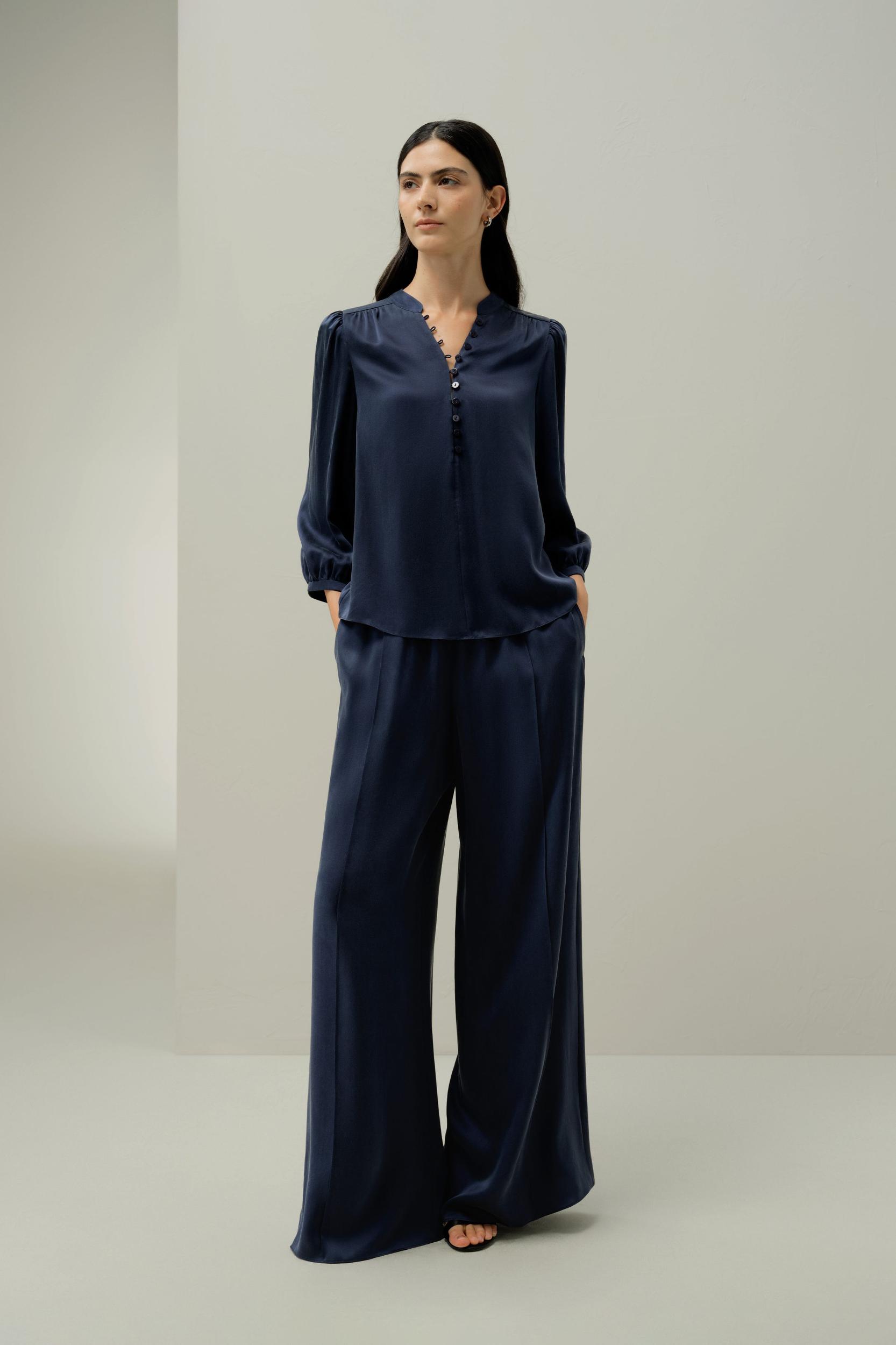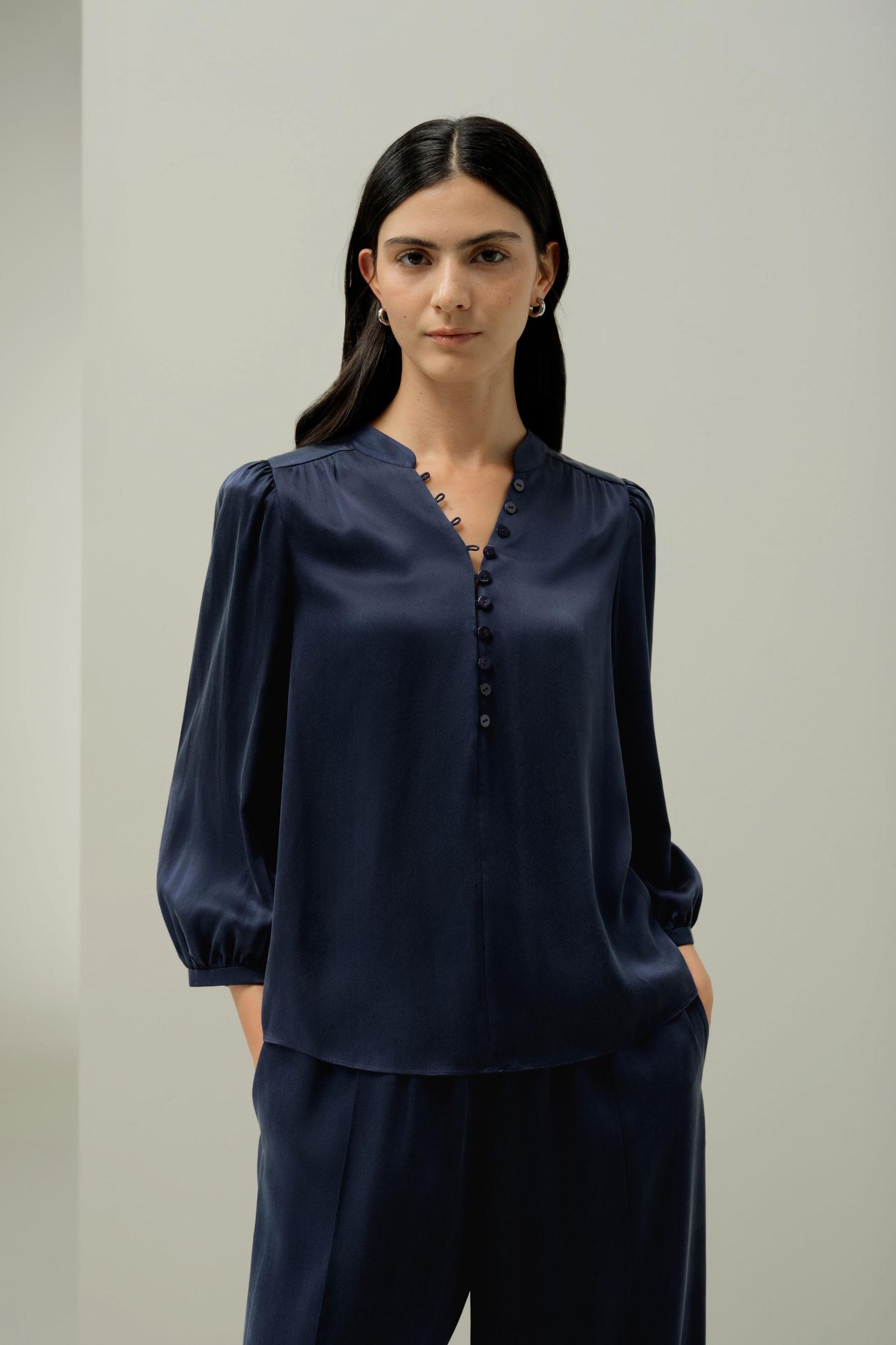Timeless elegance with this silk suede V neck blouse, featuring three-quarter sleeves, padded shoulders, and mother-of-pearl buttons. Crafted from sandwashed silk, offering breathable comfort and refined structure for warm-season sophistication.