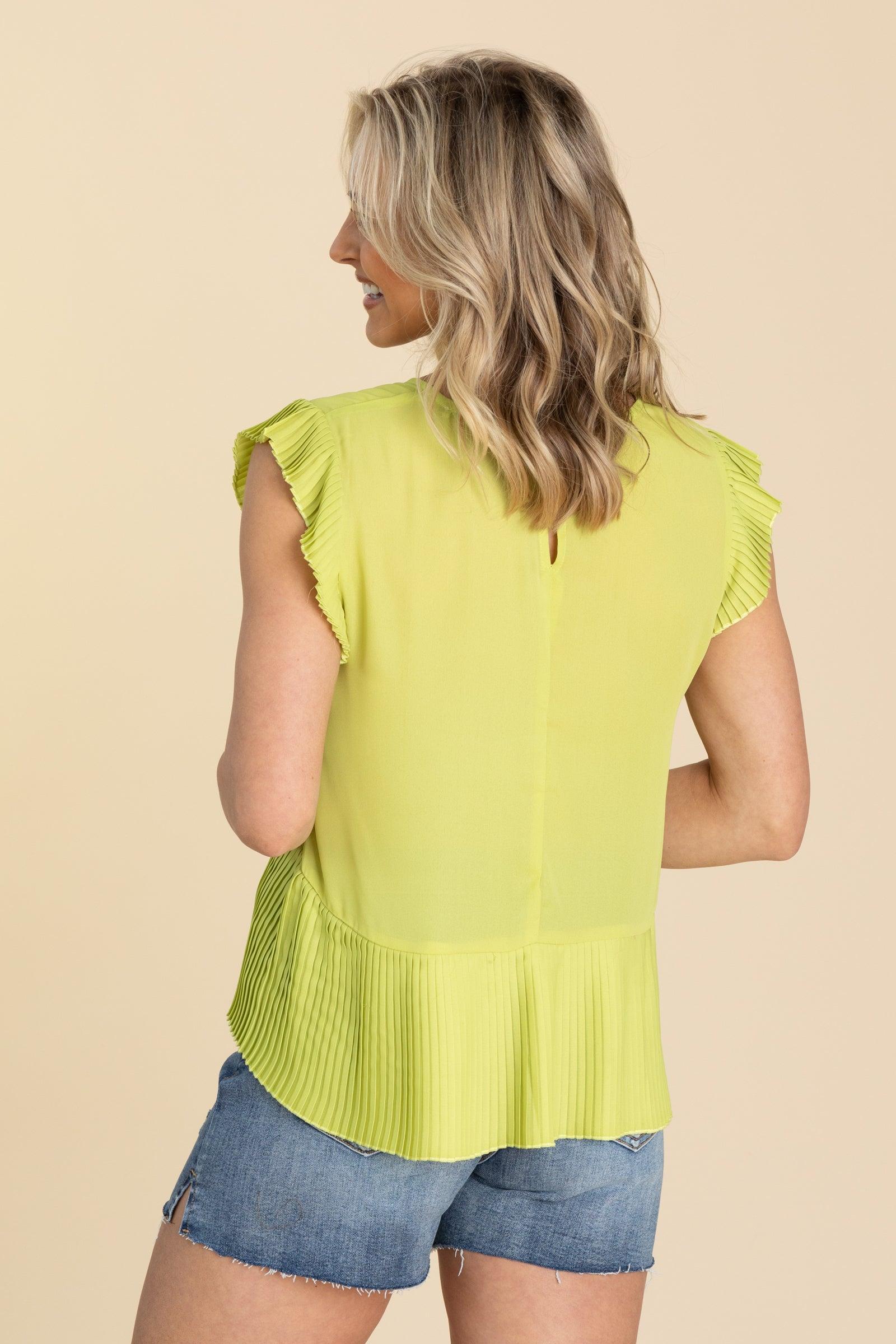 Product Details Colors: Lime Green Print: Textured Solid Neckline: Round Sleeve: Short Sleeve Hemline: Straight Ruffle Brand: Staccato Material and Care 100% Polyester Hand Wash Cold Hang/Line Dry Size and Fit Small: Bust 36" Waist 38" Length 24" Medium: Bust 38" Waist 40" Length 24.5" Large: Bust 40" Waist 42" Length 25" Sarah is 5’8” and wearing her true size small