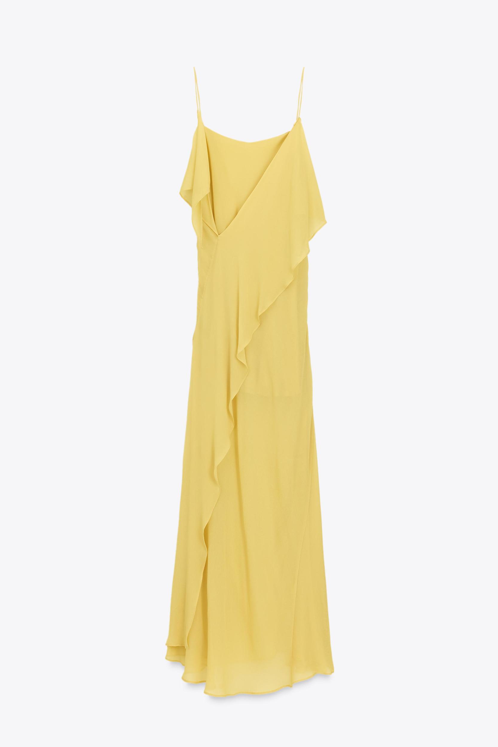 Long dress made of 100% viscose yarn. V-neck and thin straps. Pleated detail. Inner lining. Open back with asymmetric neckline. Hem with side slit. Small bag in the same fabric with buttons.