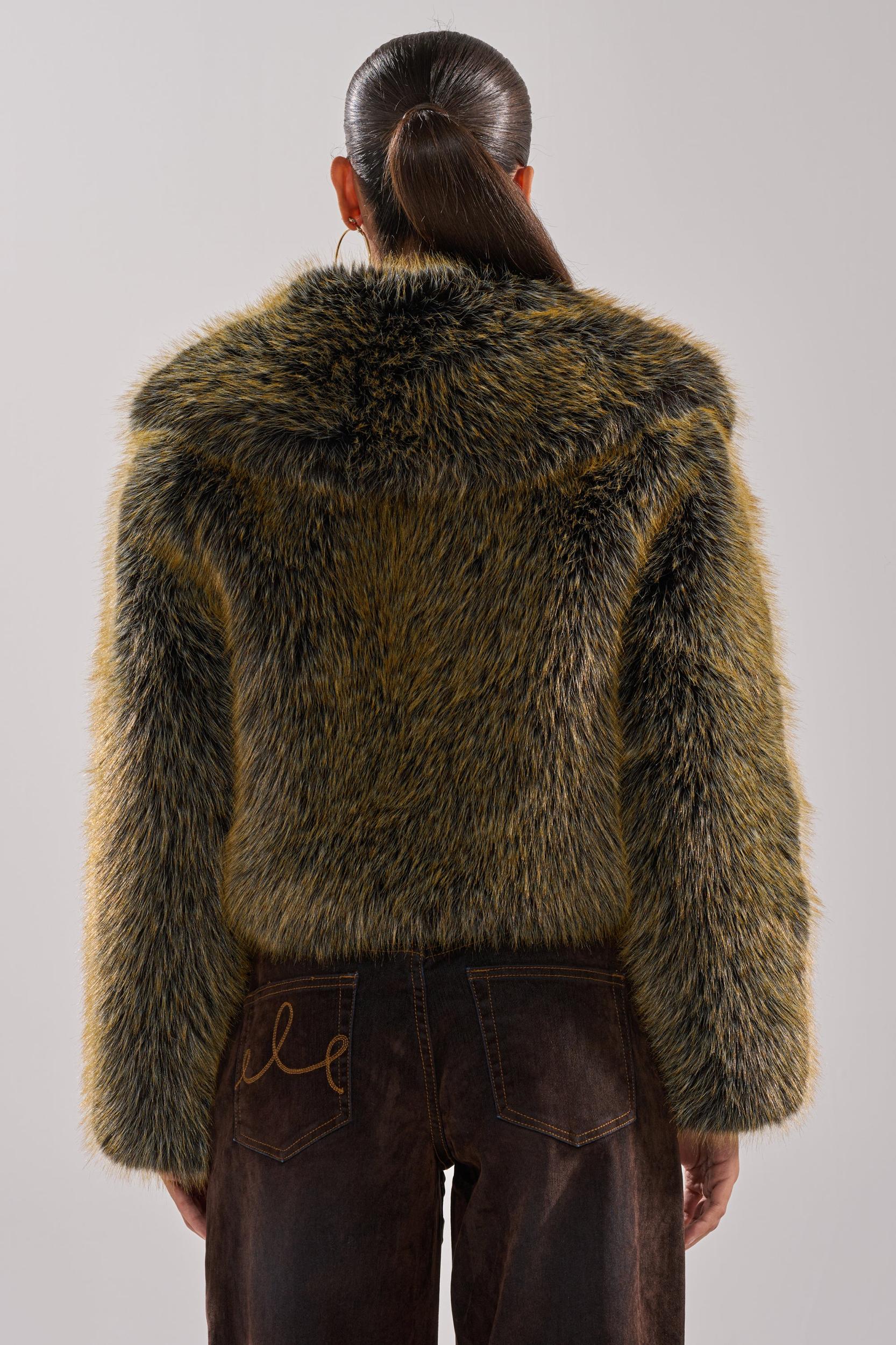 When life gives you The AKIRA Label Limoncello Faux Fur Coat, you wear it! Crafted from luscious faux fur in a two-tone colorway, this luxe jacket features an oversized shawl-style collar, a plunging neckline, long sleeves, concealed front hook-and-eye fastenings, and a sleek inner lining. Complete with boxy, waist-length fit. Style over chunky knit sweaters or suede ensembles for a cozy fall finish. - Shell: 100% Polyester, Lining: 100% Polyester- Dry Clean Only- No Stretch- Imported (all measurements approximate from size small)- 18” Shoulder to Hem- 17” Shoulder to Shoulder- 23” SleevesProduct ID: 1062507 (all measurements approximate from size 1X)- 21” Shoulder to Hem- 19” Shoulder to Shoulder- 25” SleevesProduct ID: 1062511