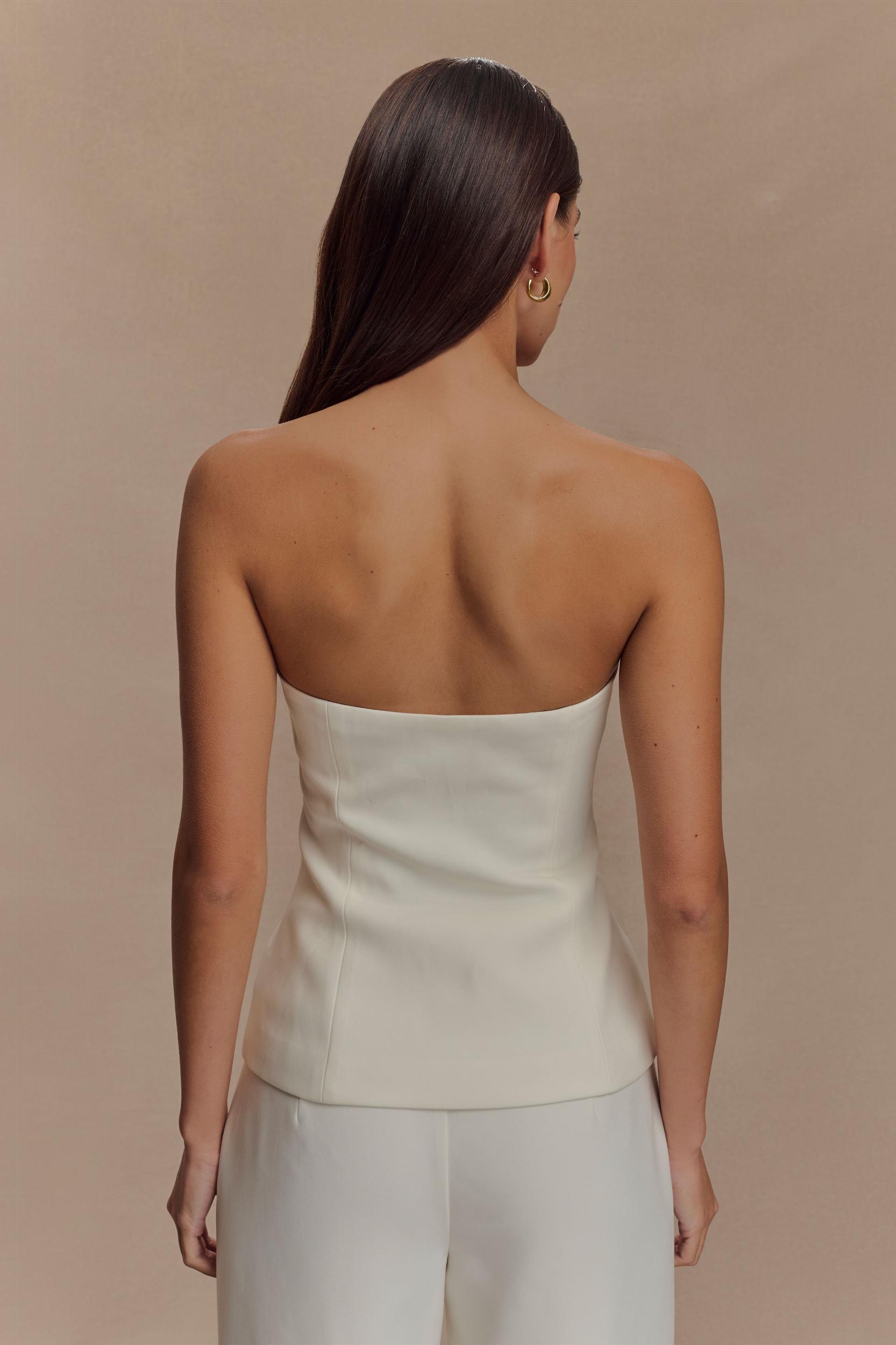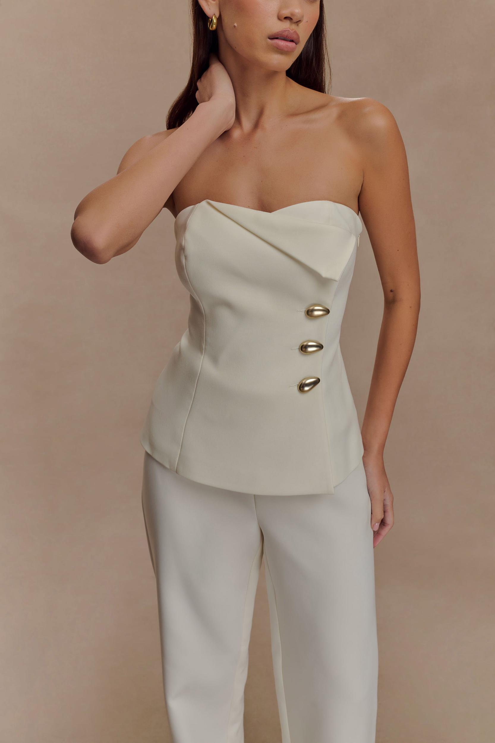 Strikingly sleek. Introducing the LINDIE Strapless Suiting Top, a sophisticated addition to your wardrobe that seamlessly combines elegance and modernity. This strapless design features a chic neck flap detail and a button front closure for a polished finish. The longline silhouette creates a flattering shape, making it perfect for pairing with the Lindie Straight Leg Suiting Pants to form a chic ensemble that exudes confidence and refinement. Fully lined for comfort and quality, this top is versatile enough for both day and night, ensuring you stand out in any setting.