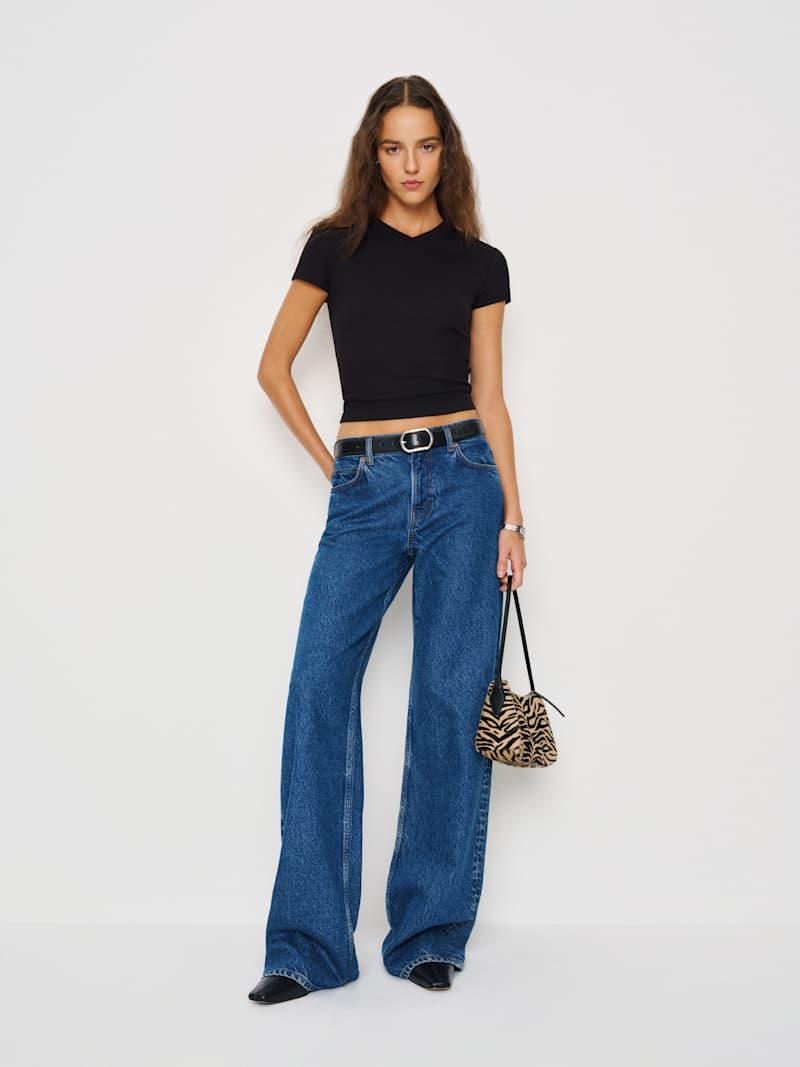 Shop the Lindie Tee from Reformation, a short sleeve knit tee with a high v neckline and cap sleeves.
