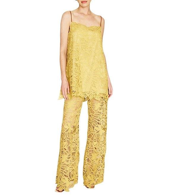 From Line and Dot, these pants feature: Lace overlay fabrication High rise Straight flare leg Reinforced waistband Hidden side zipper closure Partially lined Scallop edge detail Approx. 30.5" self inseam, 2" lining inseam, 11.5" front rise Self: polyester Lining: polyester/spandex Dry clean Imported.