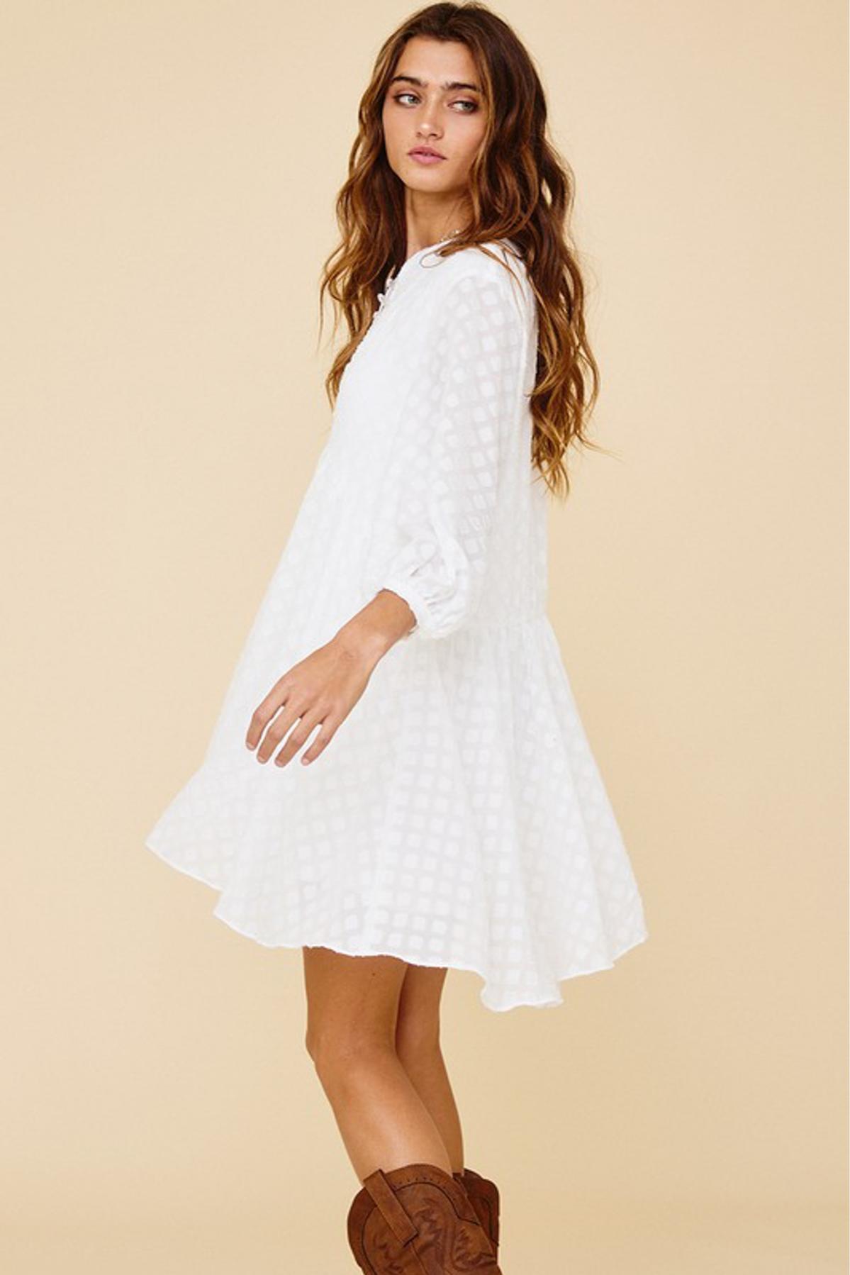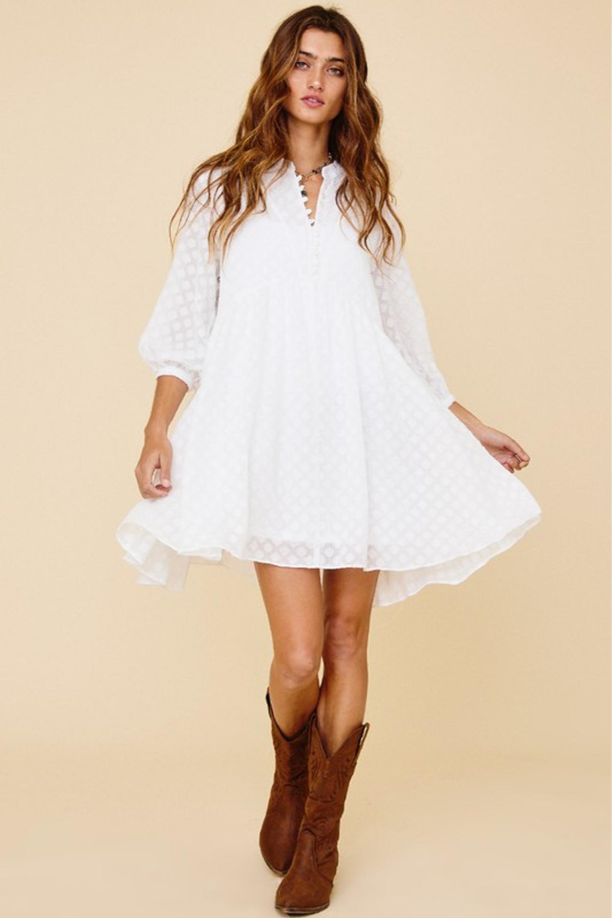 A beautiful, fresh and super comfortable dress for your Transitional wardrobe! It features an oversized roomy style for easy wear, a notch neckline with front buttons closure, slightly seen through bubble 3/4 sleeves with cuff wrists and button closure, graphic textured material, knee length, material has stretch, fully lined. Wear it for your casual weekend style. Model wears size Small L: 35" B: 19" W: 22"