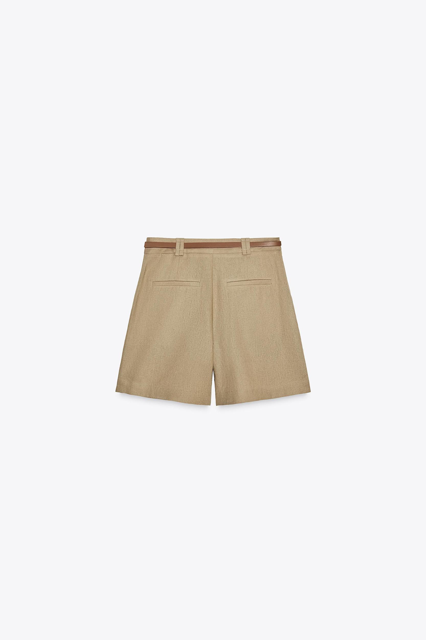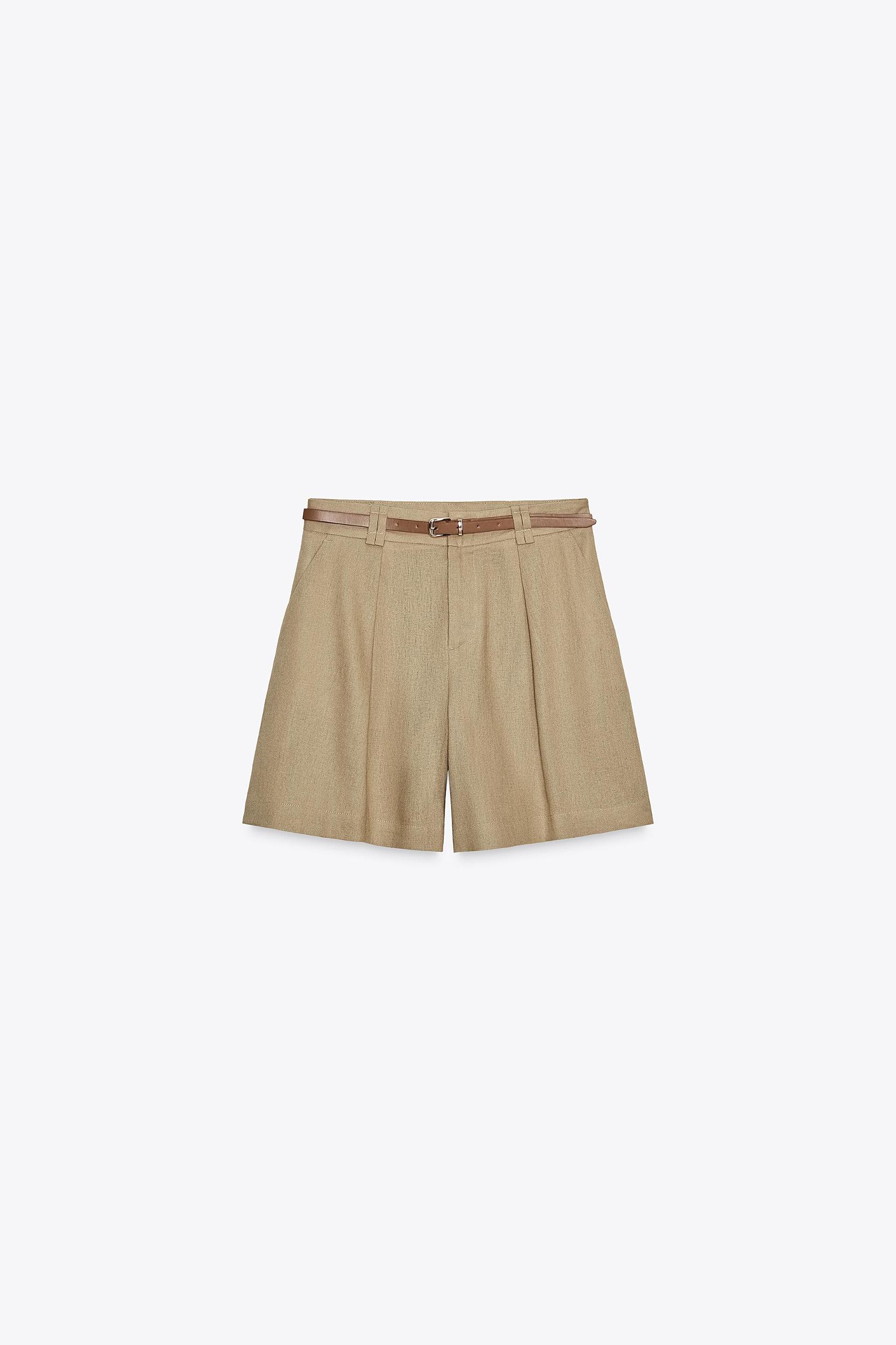 Bermuda shorts made of linen. High-waisted with front pleats and belt. Front pockets and false welt pockets in the back. Front closure with zipper, inner button and hook.