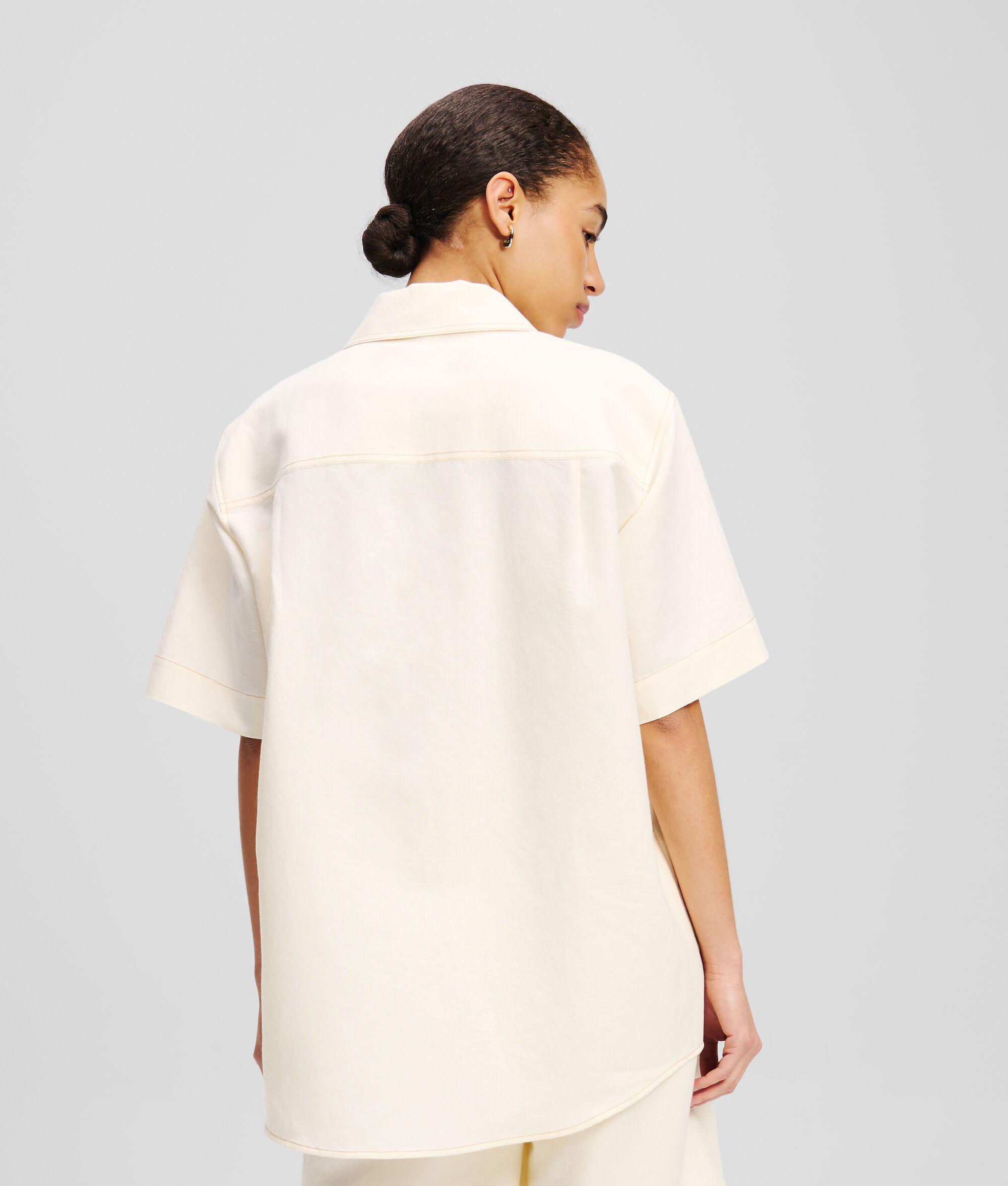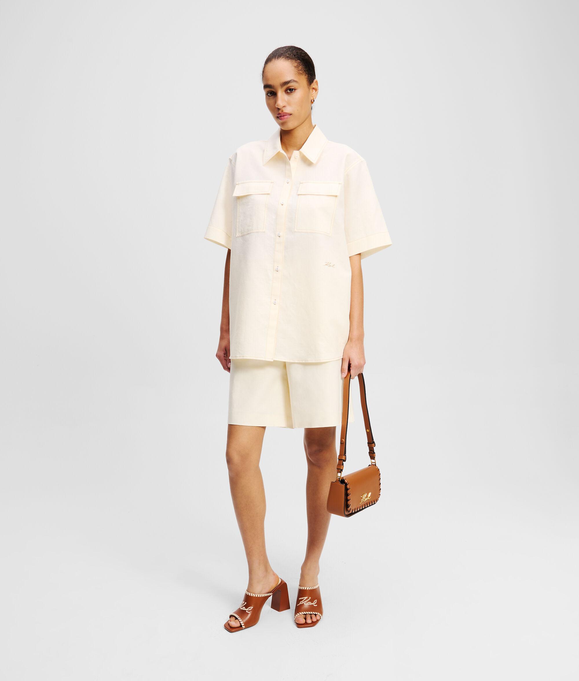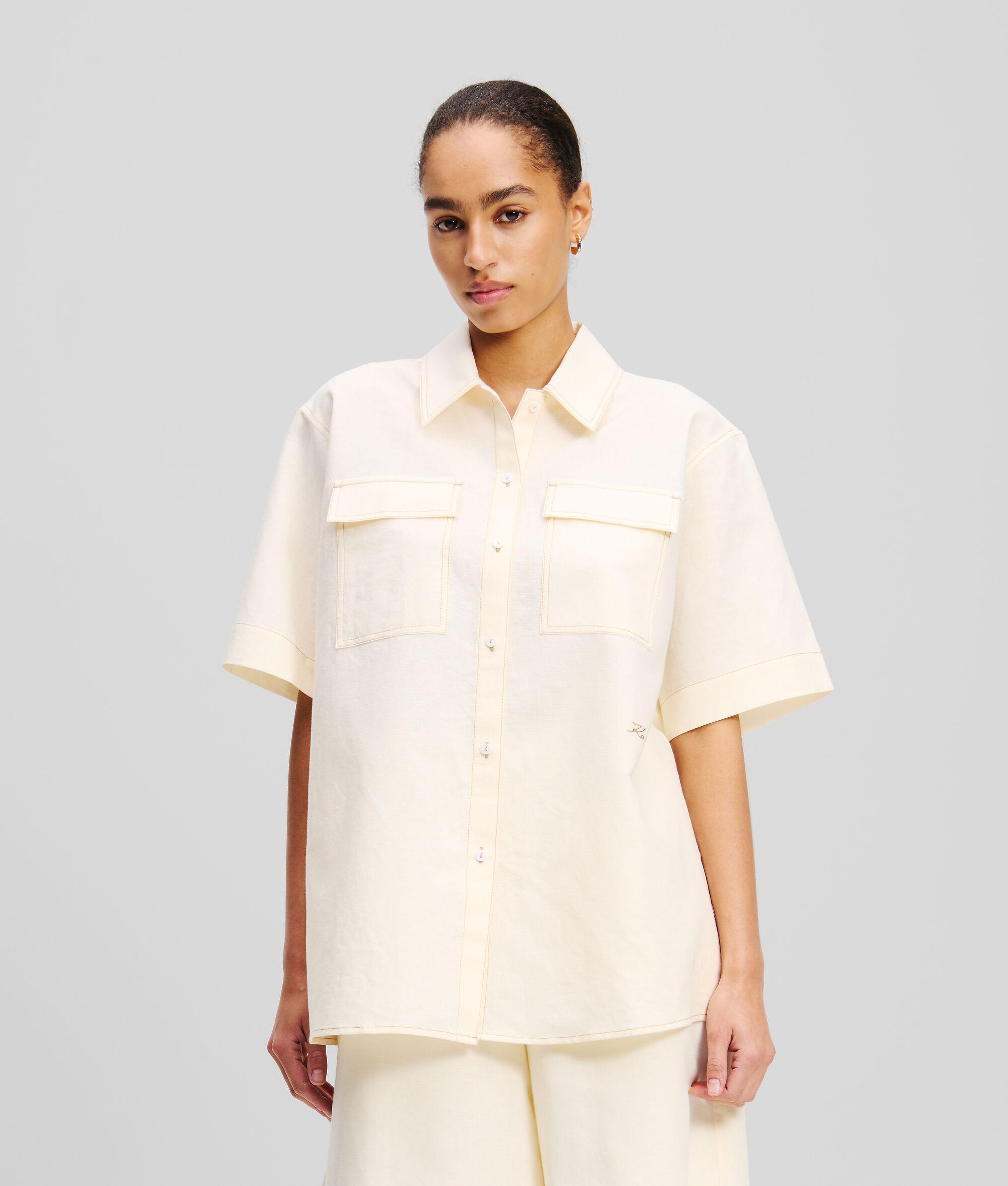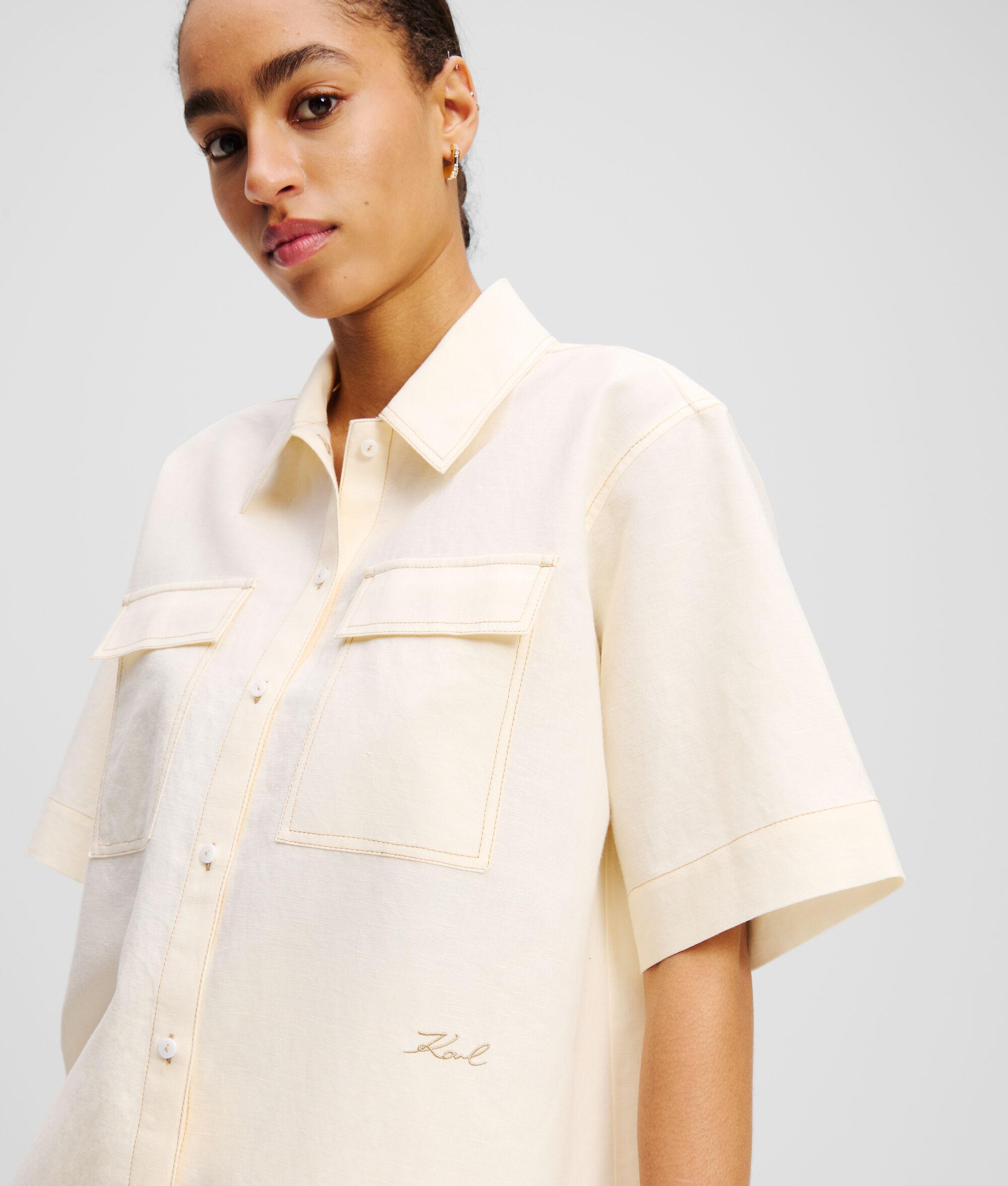 A refreshing take on casual elegance, this short-sleeved blouse is crafted from a breezy linen blend. Twin patch pockets enhance its practicality, while the KARL Signature embroidery subtly showcases iconic style.