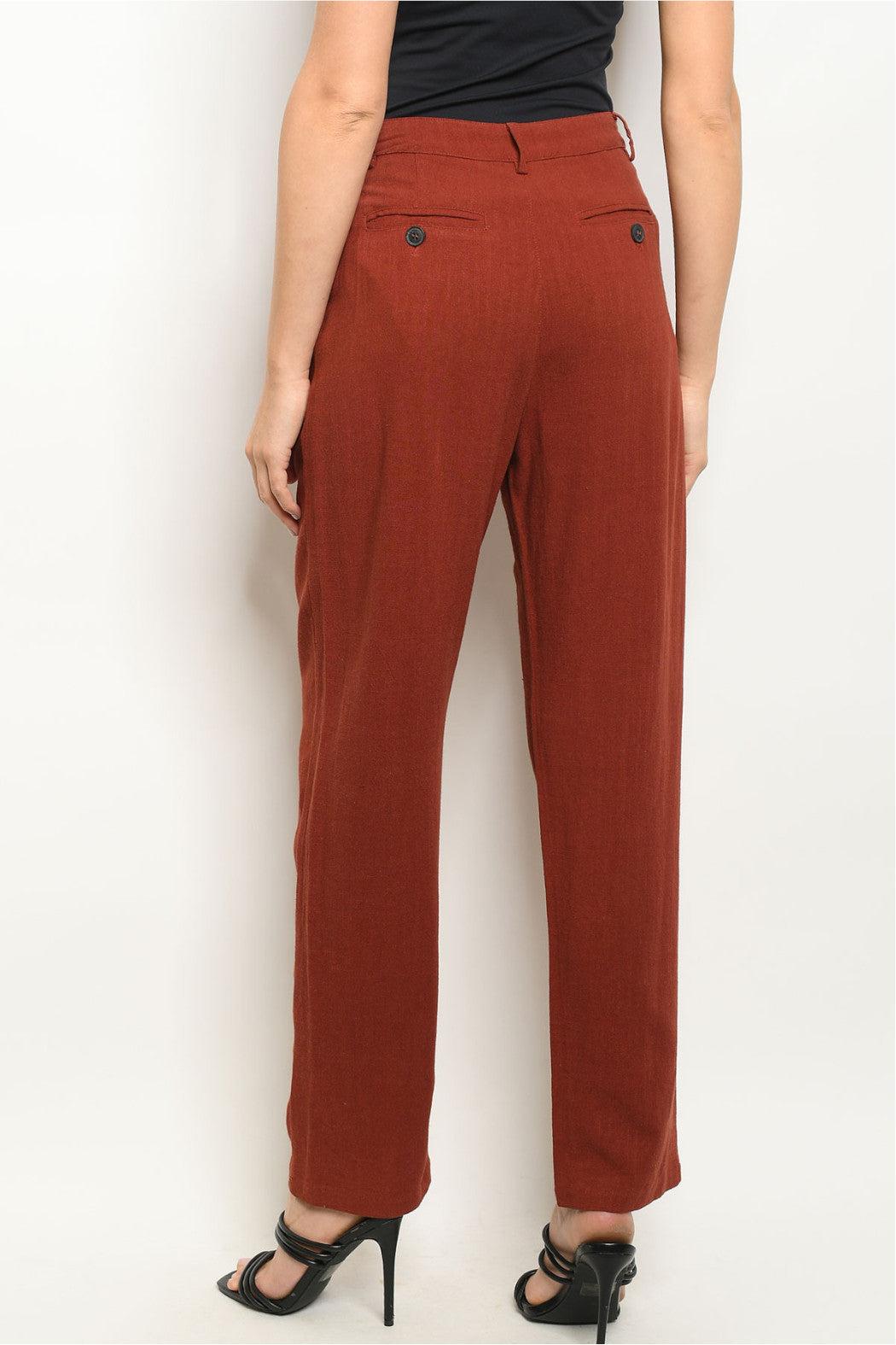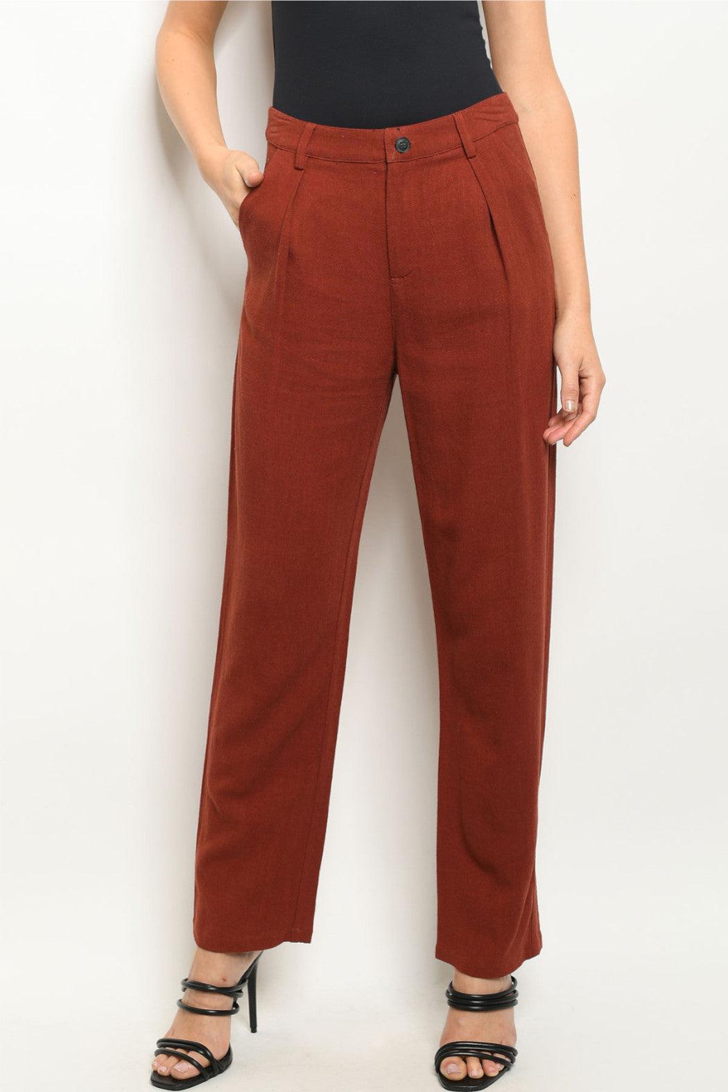 The style, color, material, these mid-season pants has it all you need for your Fall wardrobe! These super comfortable linen blend bottoms features trendy high-rise with belt loops, front pleaded detail with button and zip closure, classic straight legs, two side zipper pockets, back button patch pockets, non-stretch material, unlined, material has little stretch. Wear it at the office with a blouse, blazer, high heels or ankle boots, or just for any casual outfit with an oversized sweater and fashion sneakers when you roll them up. Also available in Olive color. Model wears size Small L: 41" W: 28" I.S.: 30"