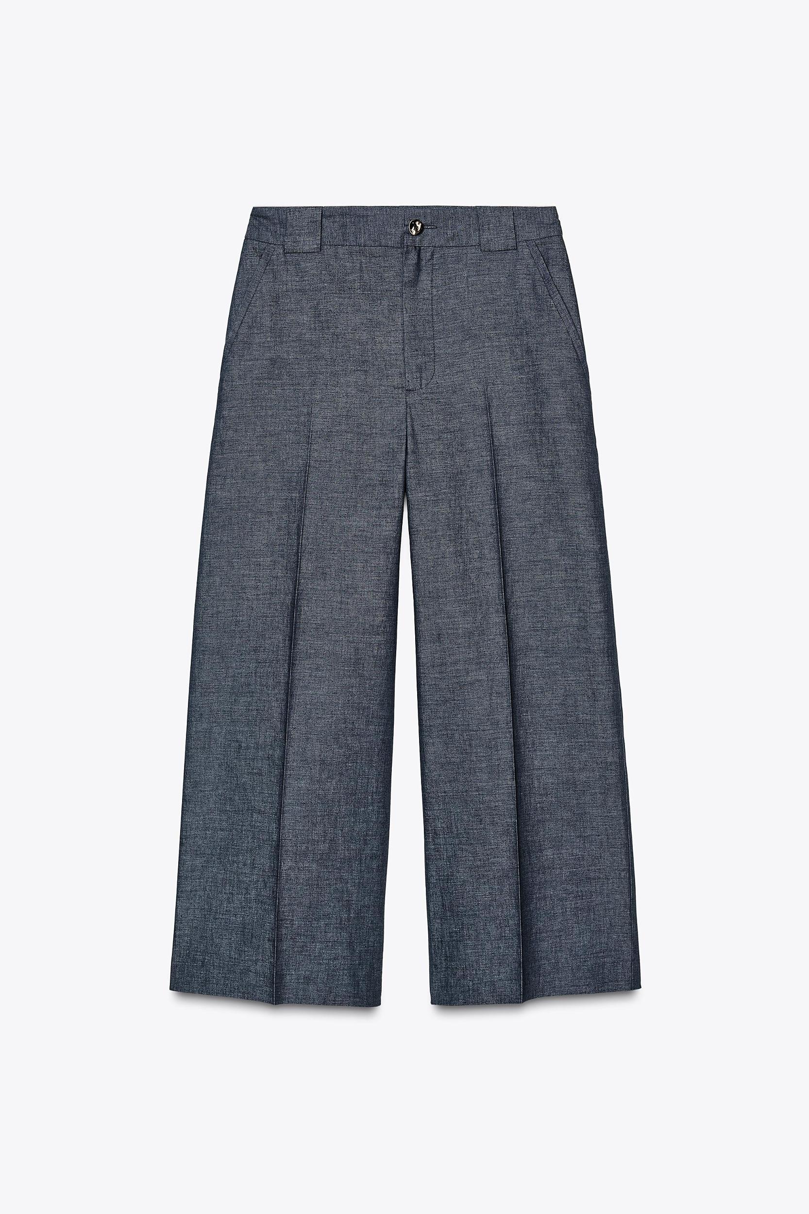 Pants made of linen. High-waisted with front pockets and back patch pockets. Wide and cropped legs. Front zip and button closure.