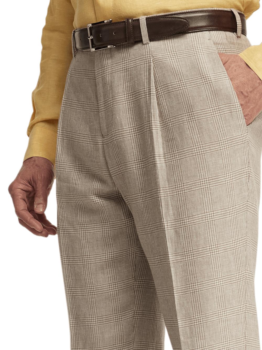 Linen Blend Plaid Single Pleat Suit Pants - Tan