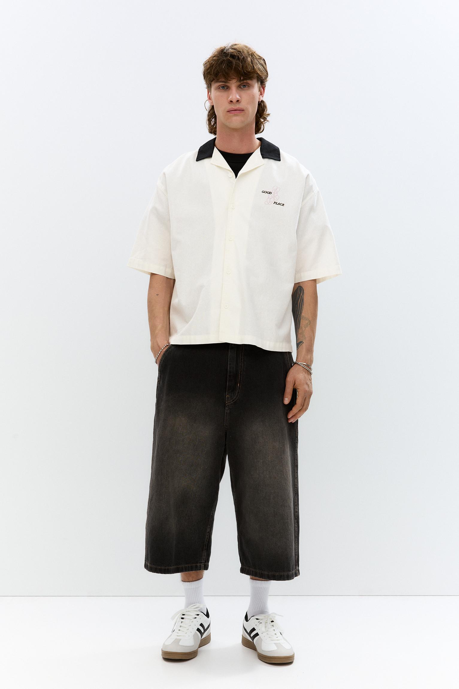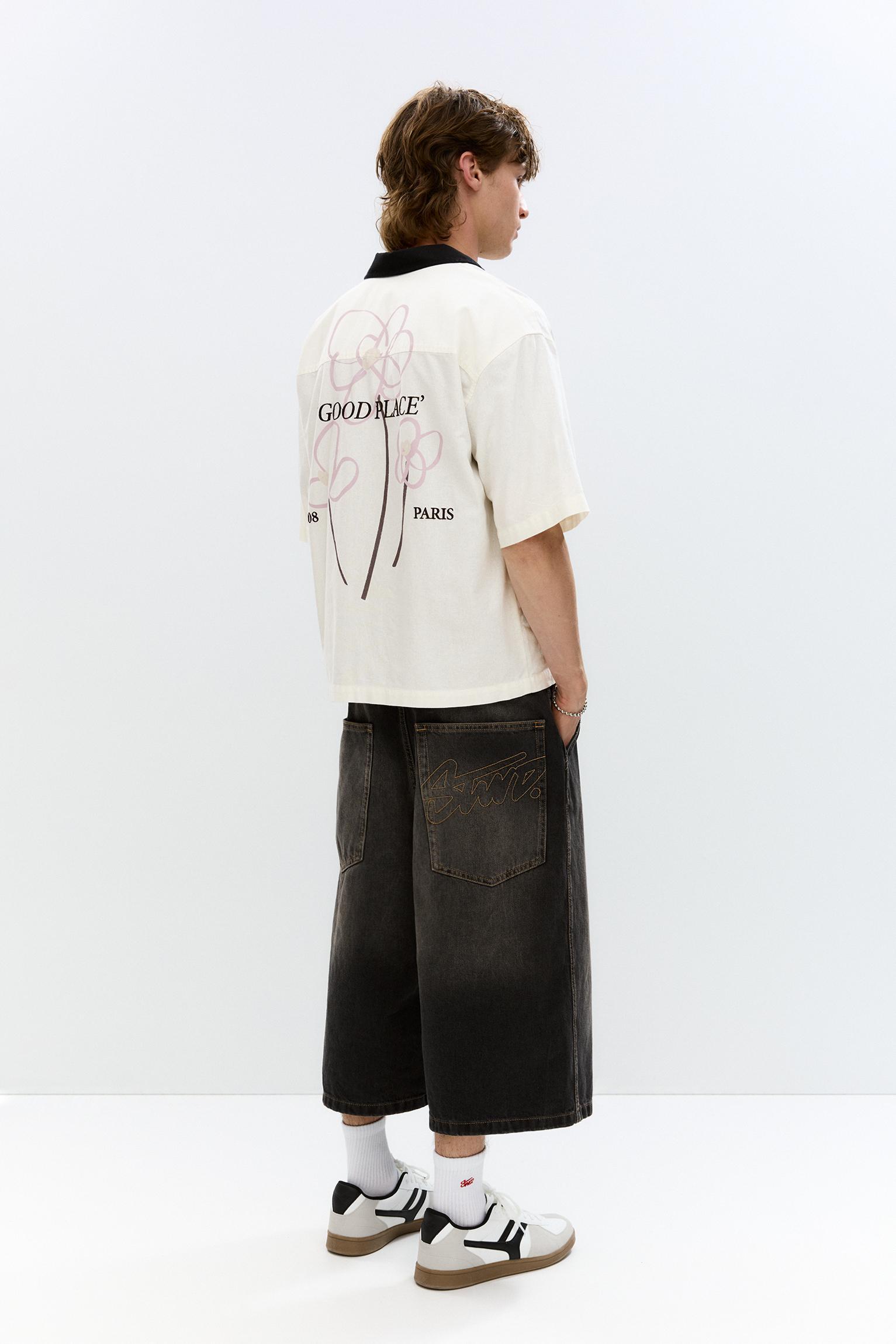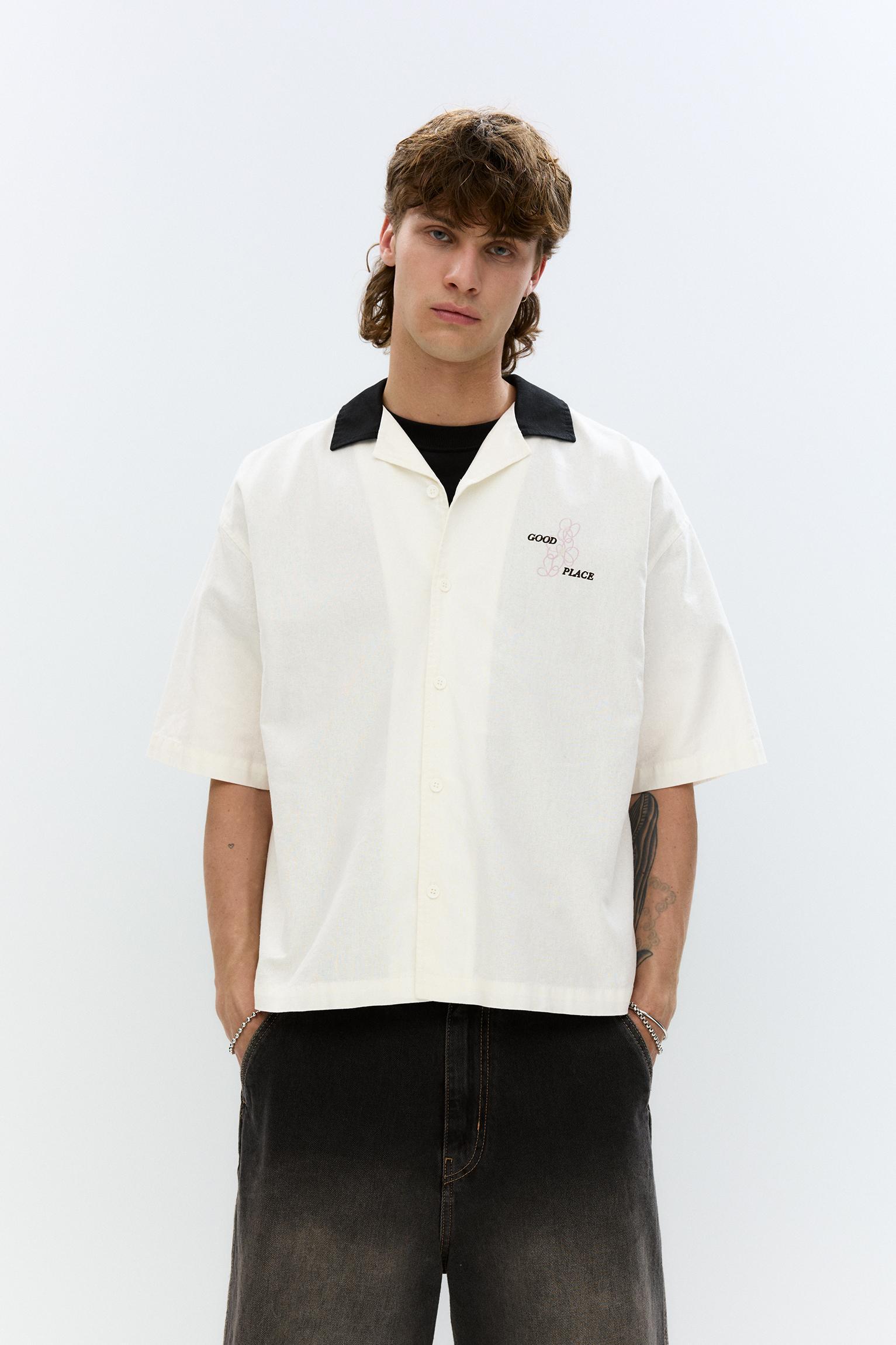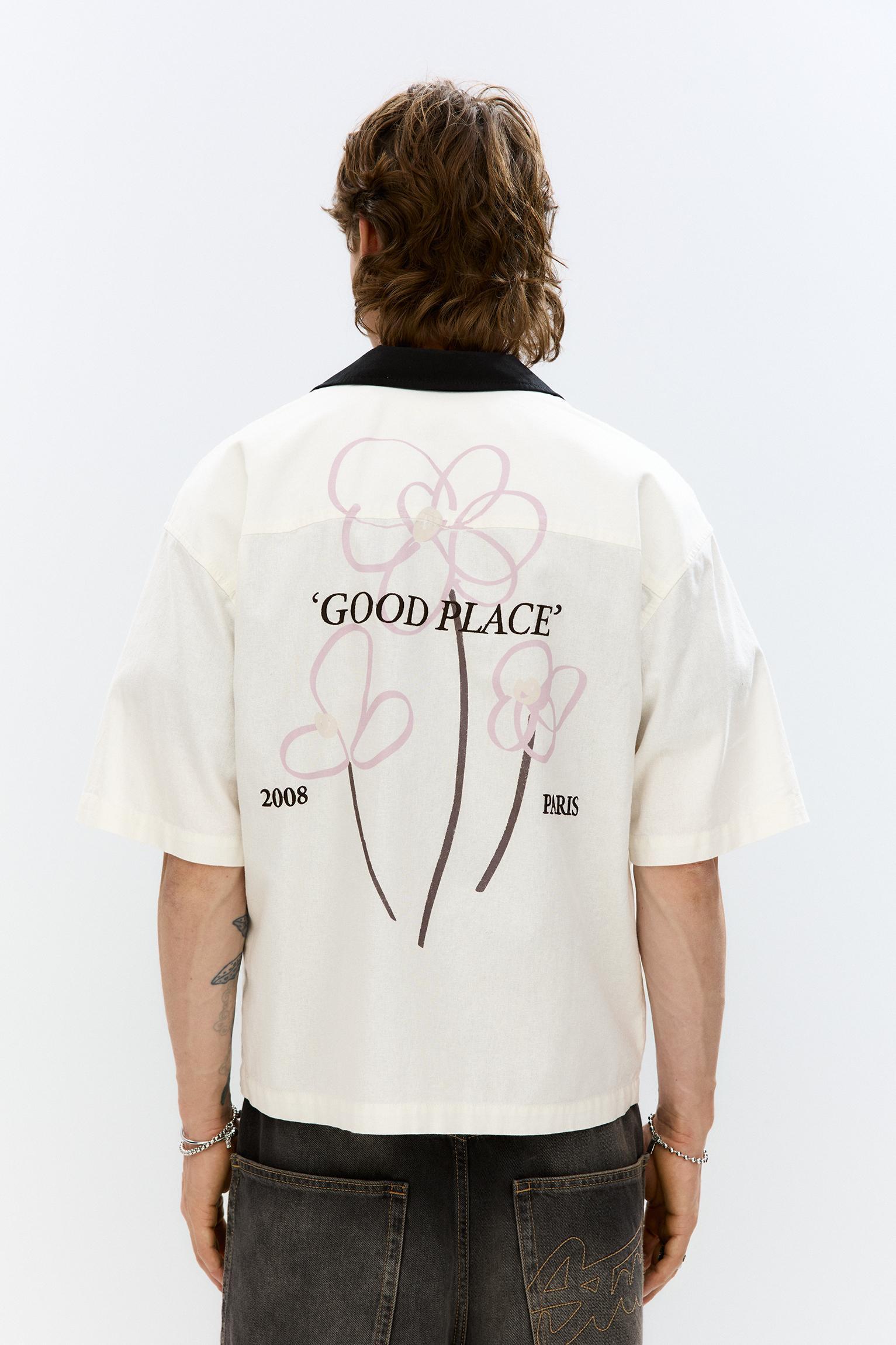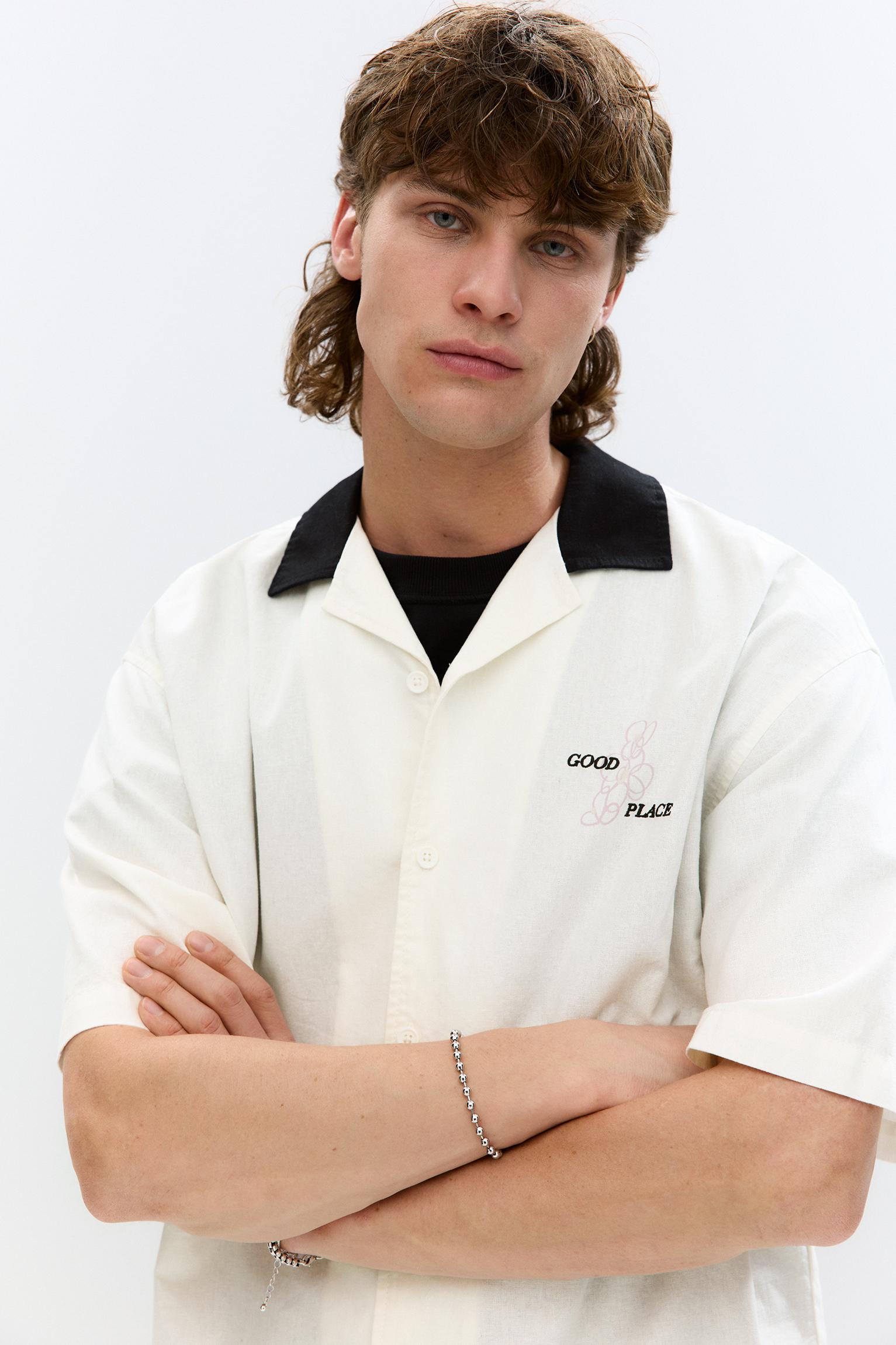 White short sleeve shirt with a contrasting collar, a graphic on the back, embroidered slogan on the front and a button-up front. Made of a linen and cotton blend.