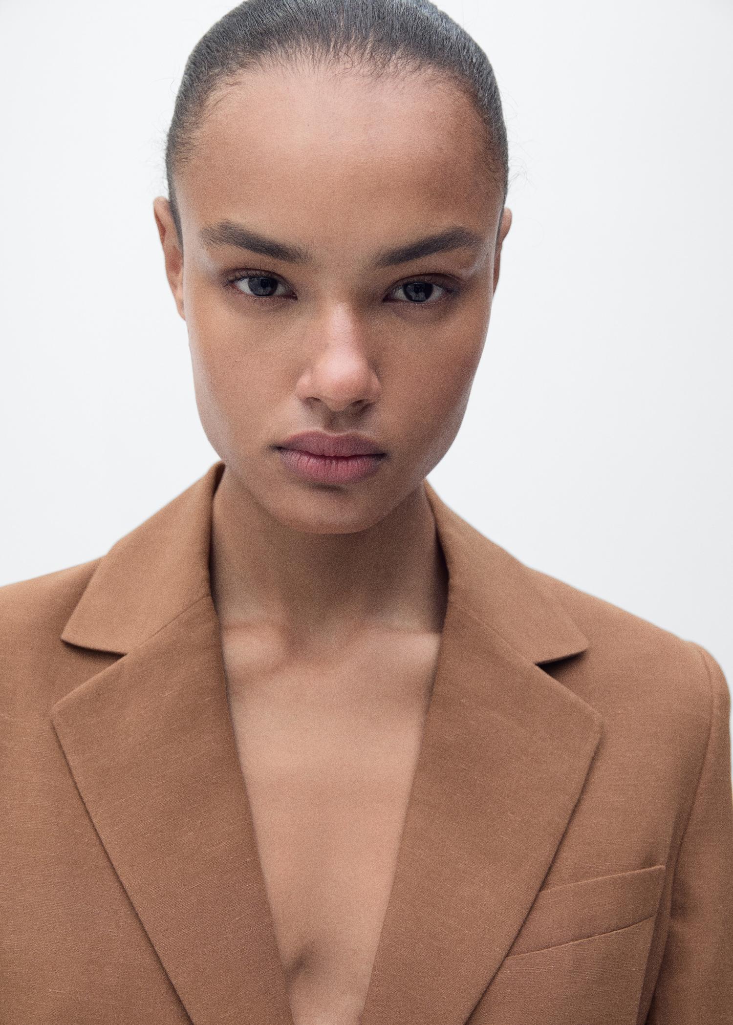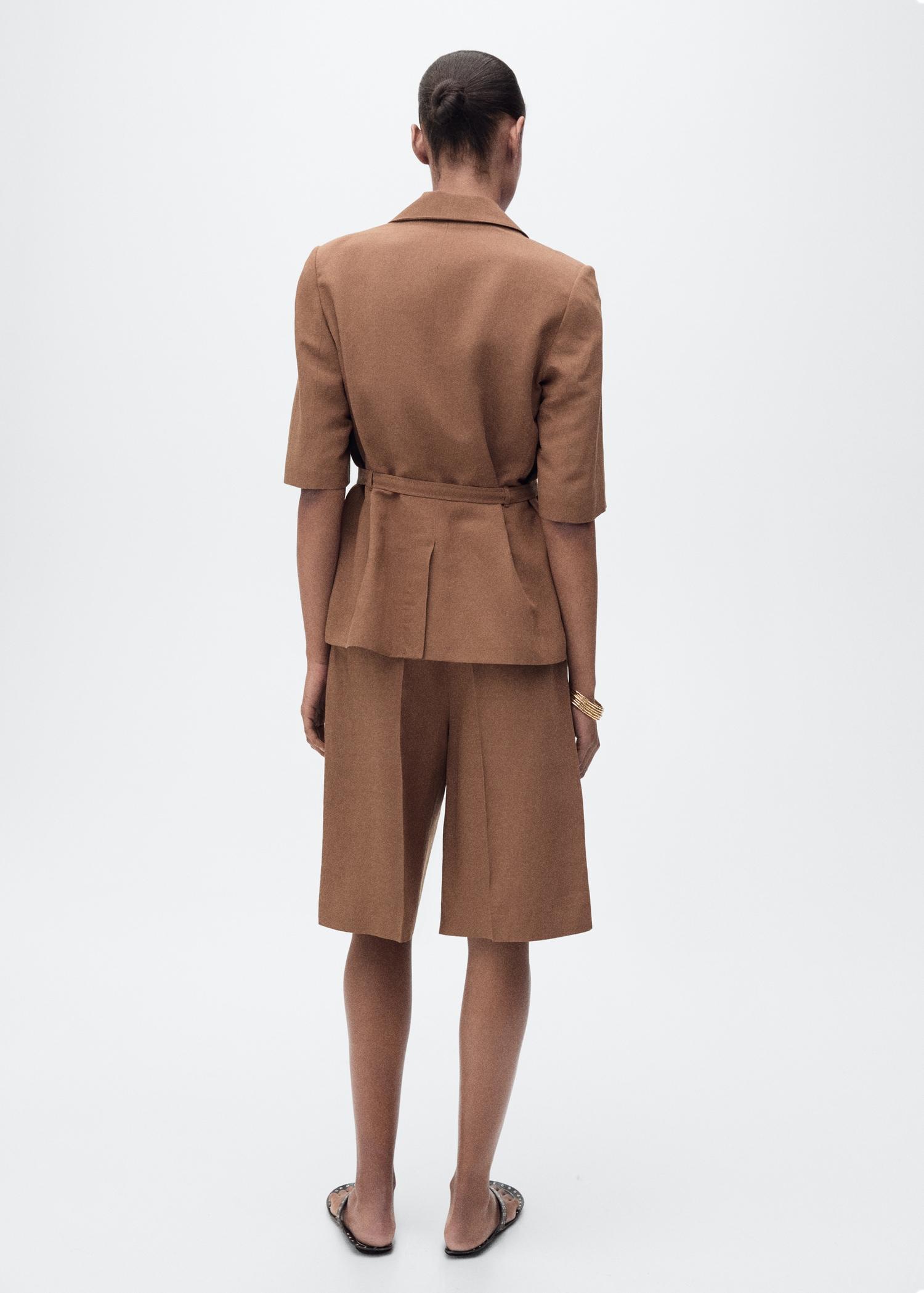 Linen blend fabric. Suit style. Straight design. Lapel-collar V-neck collar. Notch lapels. Three quarter sleeve. Belt loops. Belt buckle fastening. Two side pockets with flaps. Front button closure. Total look. Side length 18.46 in. Back length 27.48 in