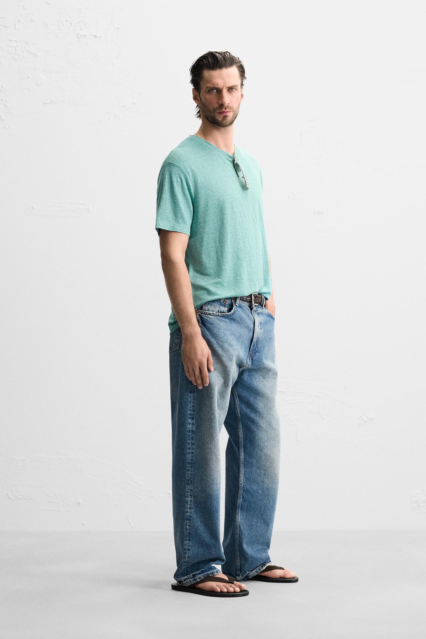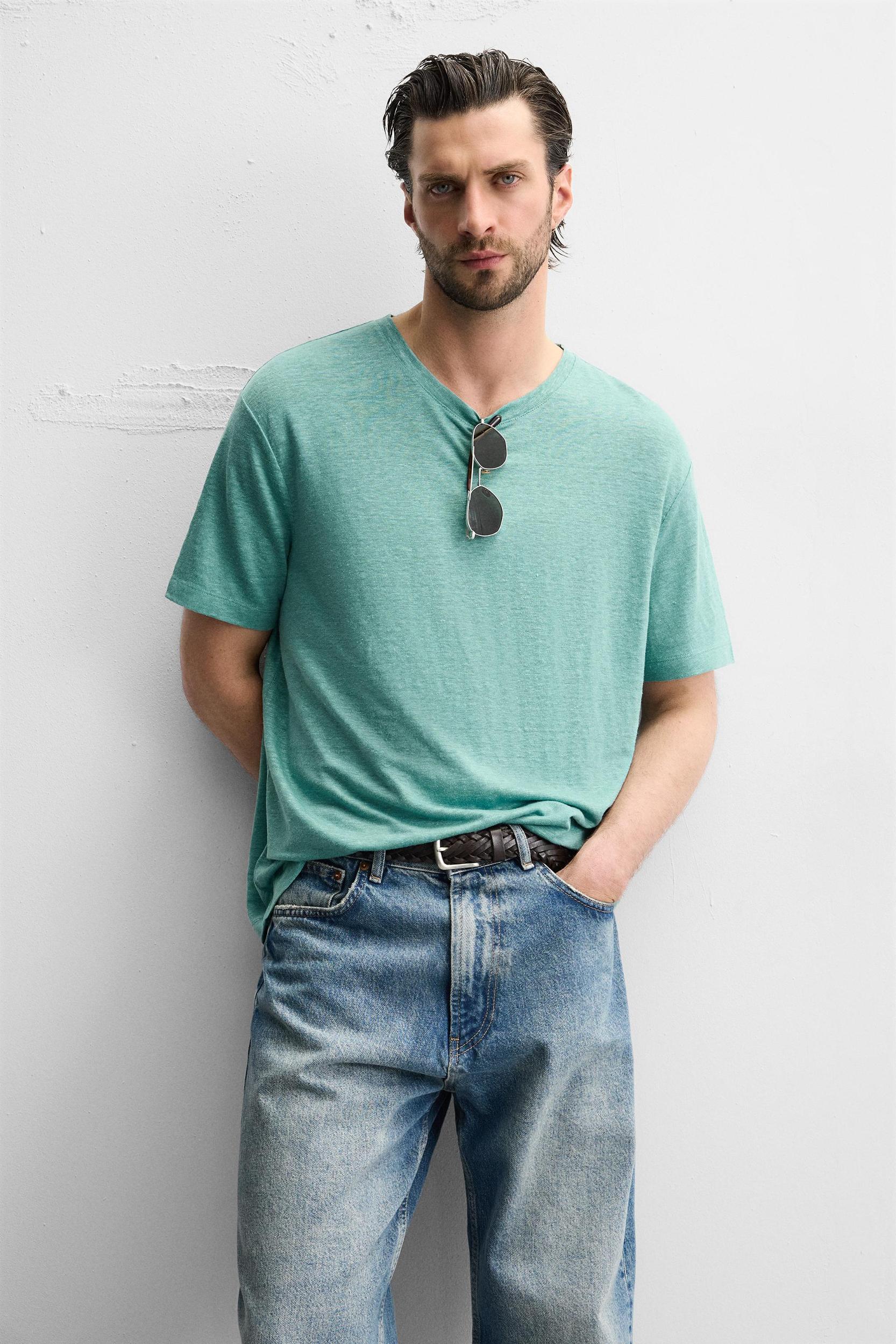 Regular fit T-shirt made in linen blend fabric. Round neck and short sleeves.