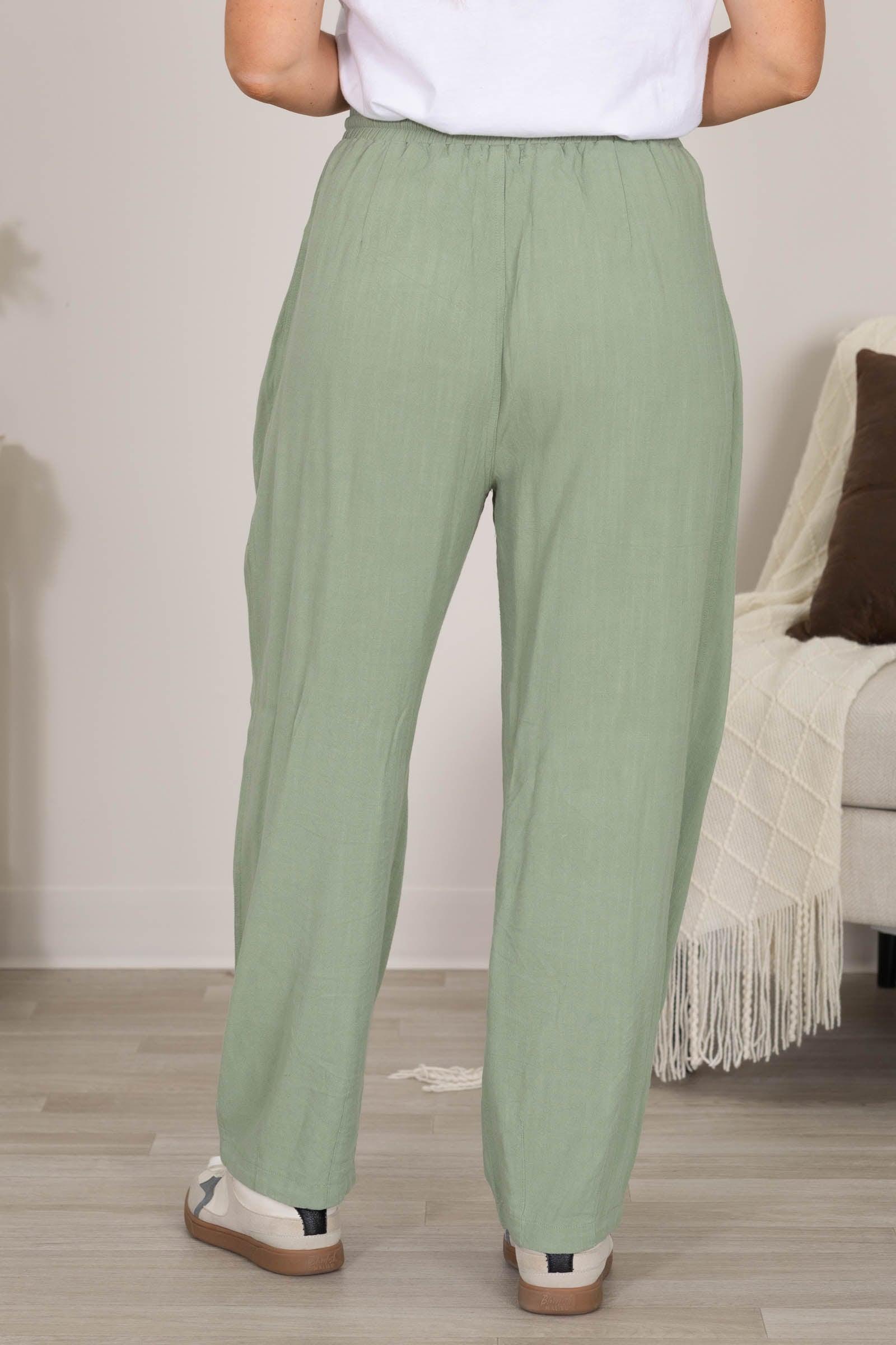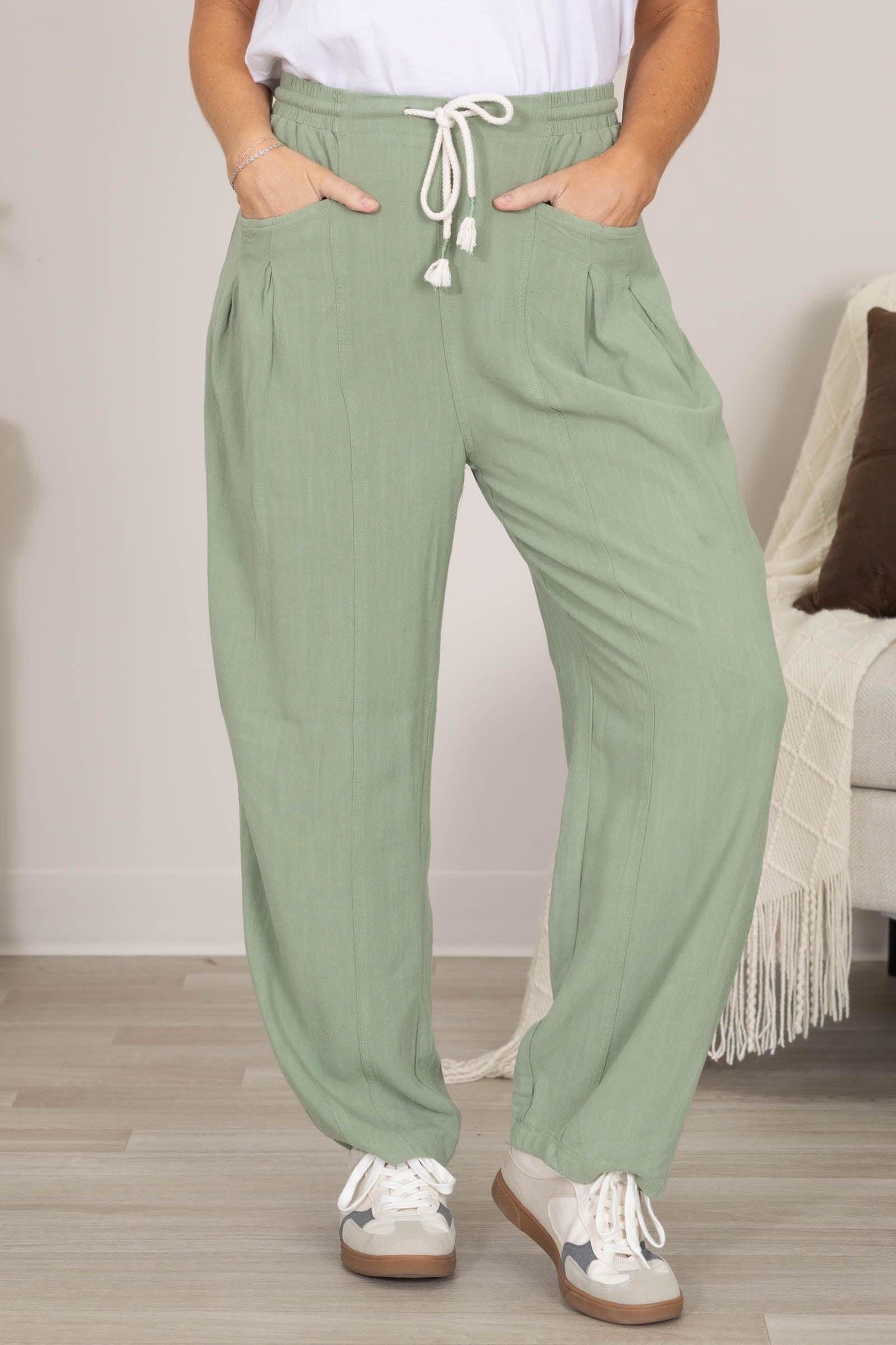 Product Details Colors: Denim Blue/ Sage Print: Solid Style: Barrel Loose Leg Pants Brand: Anniewear Material and Care 70% Rayon 30% Flax Hand Wash Cold Hang/Line Dry Size and Fit Small: Waist 28" Rise 12.5" Inseam 28" Medium: Waist 30" Rise 13" Inseam 28" Large: Waist 32" Rise 13.5" Inseam 28" X Large: Waist 34" Rise 14" Inseam 28" Erica is 5'7 and wearing a size medium