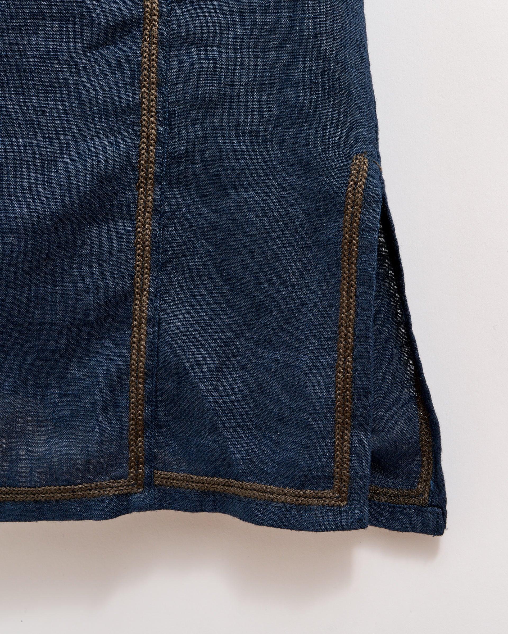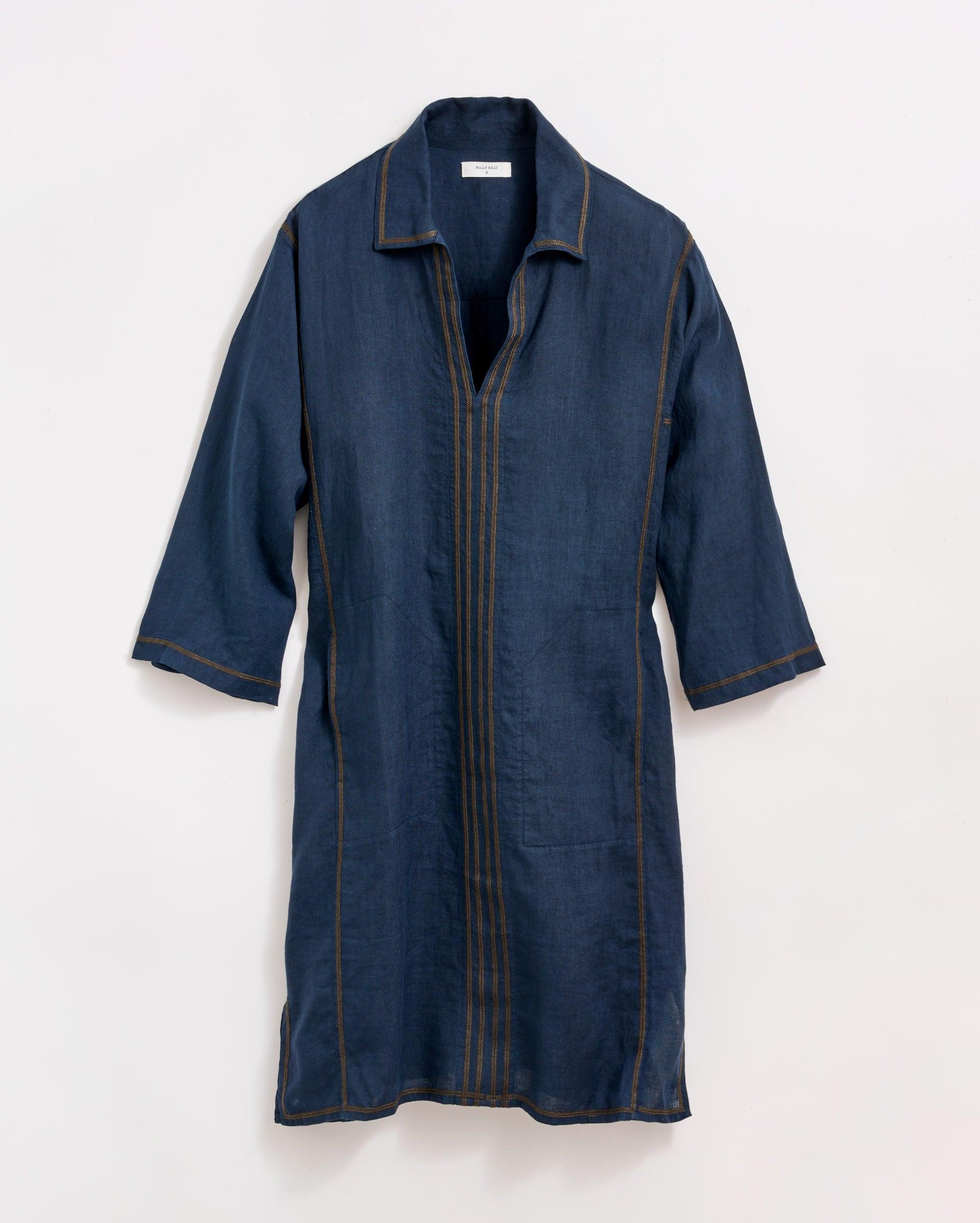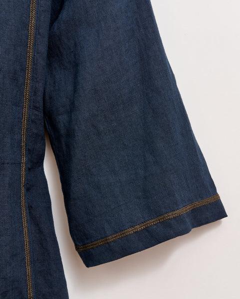 This dress is built for those warm summer evenings. The 100% linen has a weight to it to keep you warm at night but with a relaxed fit that will breathe easily during the day. The knee-length dress has seam pockets at either side and blue-green stitching at the neckline.
