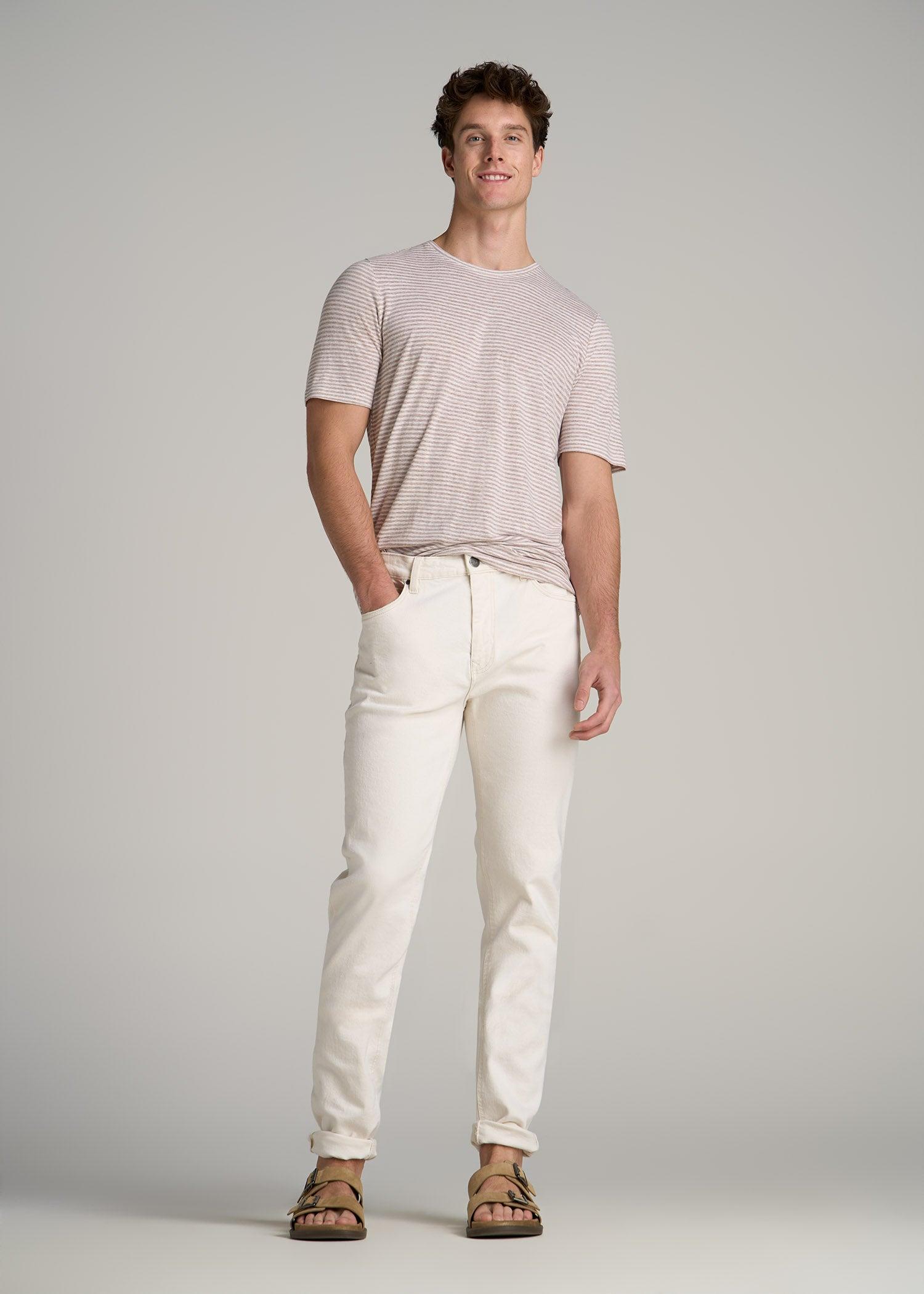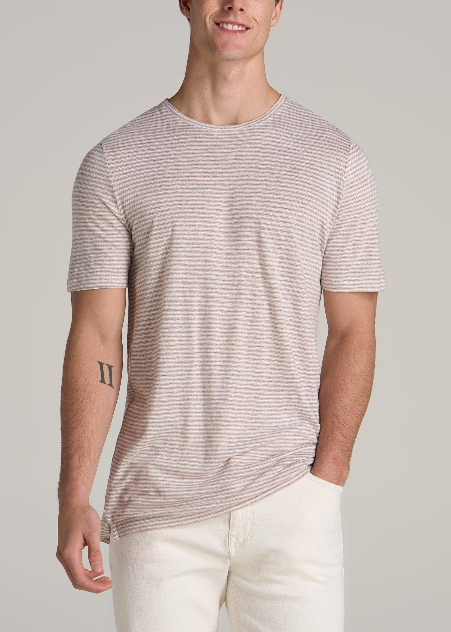 Linen Crewneck T-Shirt for Tall Men in Beige and White Stripe Male