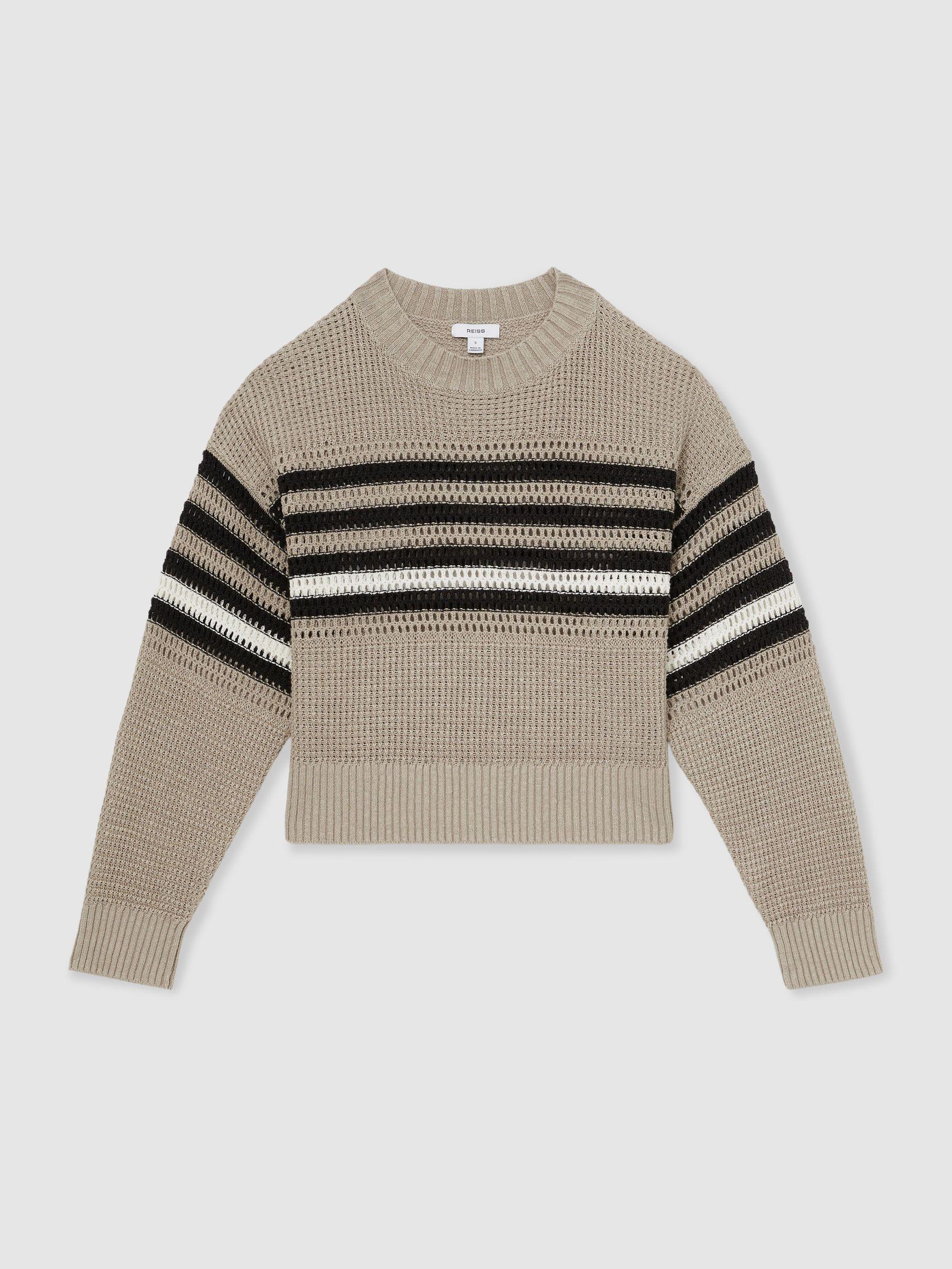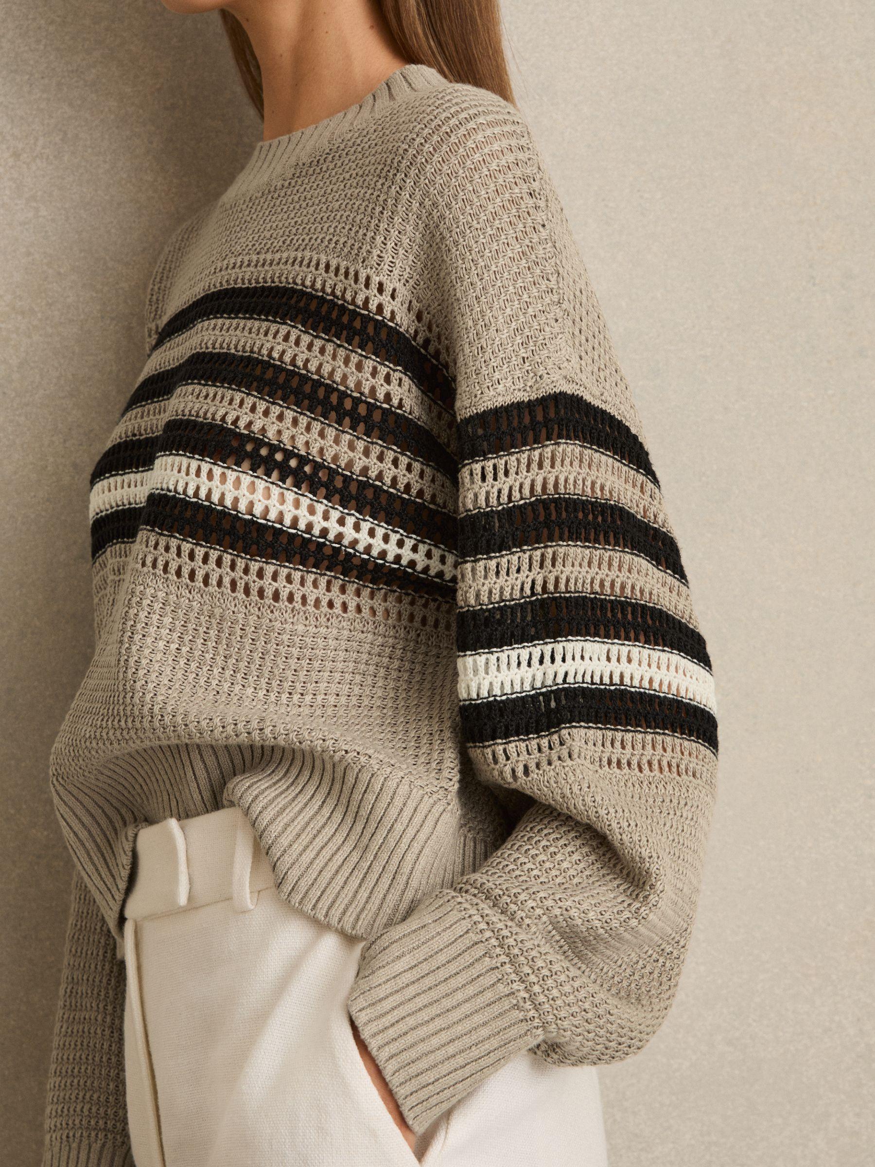The Catrice jumper is crafted from pure linen in an open crochet knit, offering a breathable, lightweight feel. Drop shoulders enhance its relaxed aesthetic, while bold stripes wrap around the centre for added interest. 100% linen. Crochet knit. Stripes. Crew neckline. Drop shoulders. Ribbed trims. Measurements of model: Height 5ft 10" / 178cm. The model is wearing a size S.