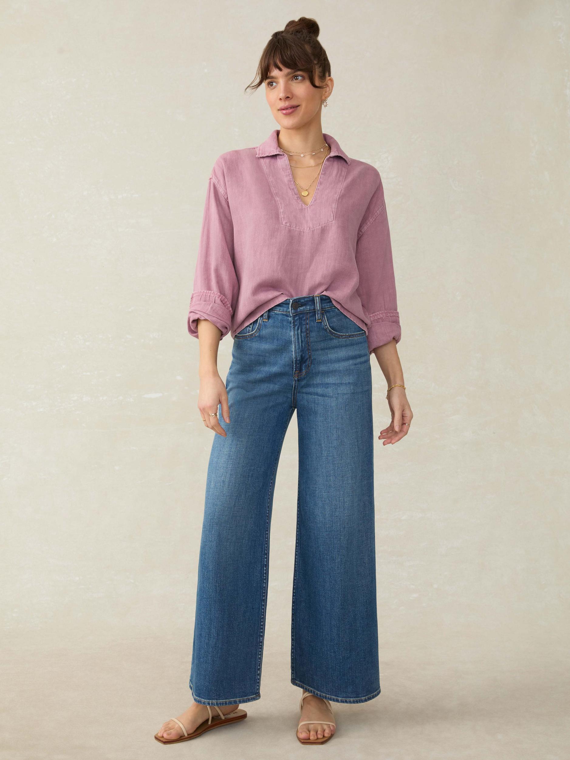 We took inspiration from vintage U.S. Navy uniform tops for this timeless shirt that’s perfect for lazy days by the shore. Crafted from a breathable cotton and linen blend, it delivers both durability and a soft touch. With its clean lines and relaxed oversized fit, this shirt adds a playful charm to any outfit, making it your go-to for effortless coastal style. Fit: Oversized Fit, Length: 27" Material: 63% Organic Cotton, 37% Linen Model: Julian is 5'8.5 wearing size Small Care: Turn inside out. Machine was cold with like colors. Gentle cycle. Do not bleach. Lay flat to dry. Cool iron if needed. WWS2525-WEO